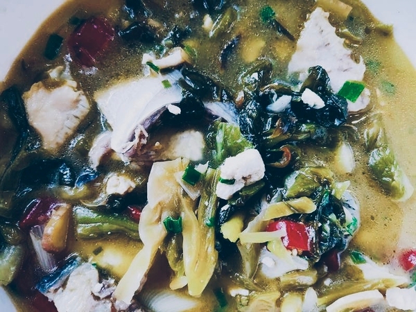 在主菜里,有酸菜鱼的鲜香,酸菜粉丝汤的酸爽,酸菜蹄髈的肥而不腻,酸菜鸡的回味悠长。作为主食,早餐有好吃的酸菜米粉,开胃解渴的酸菜豆花稀饭;中午的酸菜干饭再配点青豌豆,清淡酸香,吃起来余味无穷;晚餐的酸菜面条,吃上两口,满脸都是满足。就是在大酒店的宴席上,也有酸菜面皮,酸菜炒魔芋,酸菜面鱼子,酸菜面疙瘩这样的小吃,堂而皇之地占据在餐桌上,一点儿也不怯场。 家乡的土酸菜,就这样以形式多样,内涵丰富的形象征服着人们的味蕾,令苍溪人百吃不厌。 我爱家乡的土酸菜!