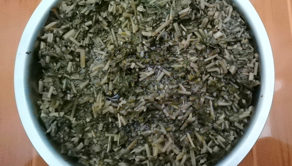 我们苍溪人做酸菜,通常会采摘新鲜的家菜叶,或者萝卜菜叶,用水将菜叶清洗干净,切碎之后,放进开水锅里烫一下,再捞起来沥干水分放入缸中,再将面汤煮得稀稀的,趁热倒入菜里,然后盖上盖,密闭保存。这样,经过时间和温度的催化,两三天后,就可以吃到自然发酵好的味道正宗的土酸菜啦。