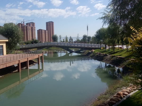 这是市民公园中湖上架着的玉带桥,它的周围立着许多柱子,柱子上写着许多生僻字,激励着我们学习更多的中国文化。