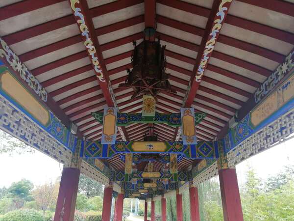 在寺庙的后面有一个走廊,取名曰“仙女廊”,有颐和园长廊的神韵,估计是设计师仿照颐和园修建而成,两排古色古香的朱红走廊,向前延伸着,顶上是蓝色的各式雕花,有龙凤呈祥、奇花异草、历史人物等待,是人们纳凉、避雨的好地方,更是我们每次秋游摆开零食的好餐桌。