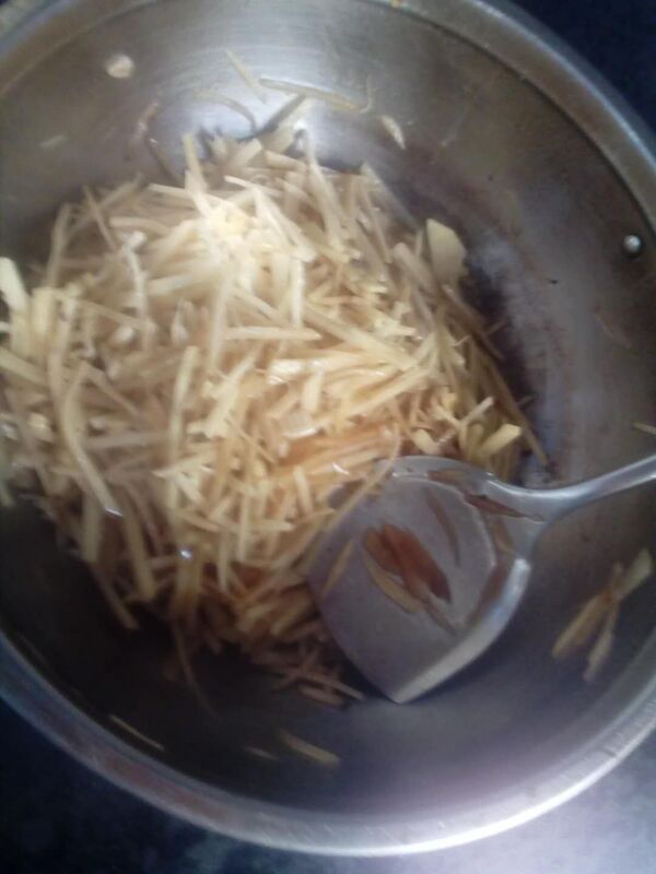 在老妈的指引下一切都准备好了。点火"啪"的一声,蓝色的火苗从灶火里蹿了出来。我按照妈妈的意思往锅中倒少许油,并轻轻晃动。油温五成热时,我就将筐里的材料一股脑倒进了锅,只听"刺啦"一声,油水乱溅,我被吓得不知所措。"别怕,赶快翻炒,要不就粘锅了"妈妈温和催促着。在妈妈的提醒下,我抄起锅铲胡乱搅拌了一通。这下可好,丝儿欢快的从锅里蹦到了灶台上,妈妈忙接过铲子,一翻一推力道恰到好处。