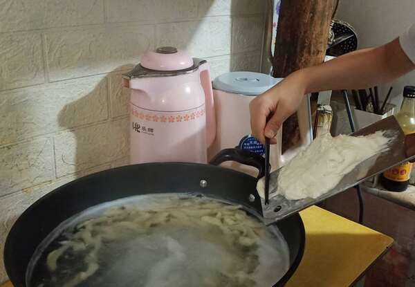 在锅中倒入适量的水烧开,把和好的面弄一小部分抄到菜刀上,再拿一根筷子,把面滚成大小一样的小棒棒,放到锅中。初学者可能很慢,但做几次后就可以很快的把面团都一一下到锅中了。等面煮熟后,用漏勺捞出来,用凉水浸泡一会。