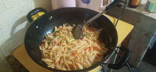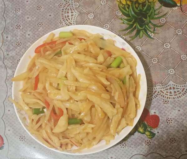 在我的家乡有数不尽的特色小吃。今天,我给大家介绍一种我最爱吃的美食——炒疙瘩。家里人干活累,或者是懒得不想做饭。所以它在我们这里还有一个美名叫——"懒疙瘩"。 做炒疙瘩只需要三个步骤:和面,煮面,炒面。想要做出有嚼劲的炒疙瘩,必须要把面和好。和面也是个技术活,在盆子里倒入适当的面粉,再倒点凉水,开始和面。拿一双筷子来回的搅,一直搅到不软不硬,在把和好的面醒一会儿,这样做出来的面才好吃,才有劲道。