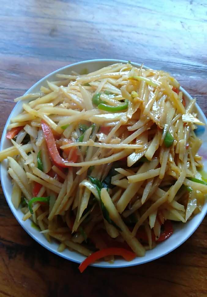 幸好妈妈提醒我放入土豆丝,我才从惊吓中出来,三下五除二的放入土豆丝。炒了一小会,再倒入醋烹出香味,最后放入其它调料,翻炒均匀就可以出锅了。 现在很多餐厅都有了土豆丝的身影,虽然我炒的土豆丝不是色泽光亮,但也是酸辣可口,也有着丰富的营养。这次炒土豆丝让我知道了,干什么都不容易,都要下苦功!我们的学习也一样,不能偷奸耍滑。 这就是我家乡的酸辣土豆丝,你想尝一口吗?