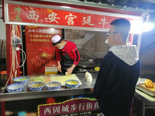 通常我买了两个牛肉饼之后,总是会配上一碗牛奶醪糟,用兰州话说,就是“满福地很呐”! 夜市上的吆喝声继续传来,锅碗飘勺的声音汇成了一首动听的交响乐。热闹的步行街夜市为西固人民带来的方便,给西固城带来了无限生机!