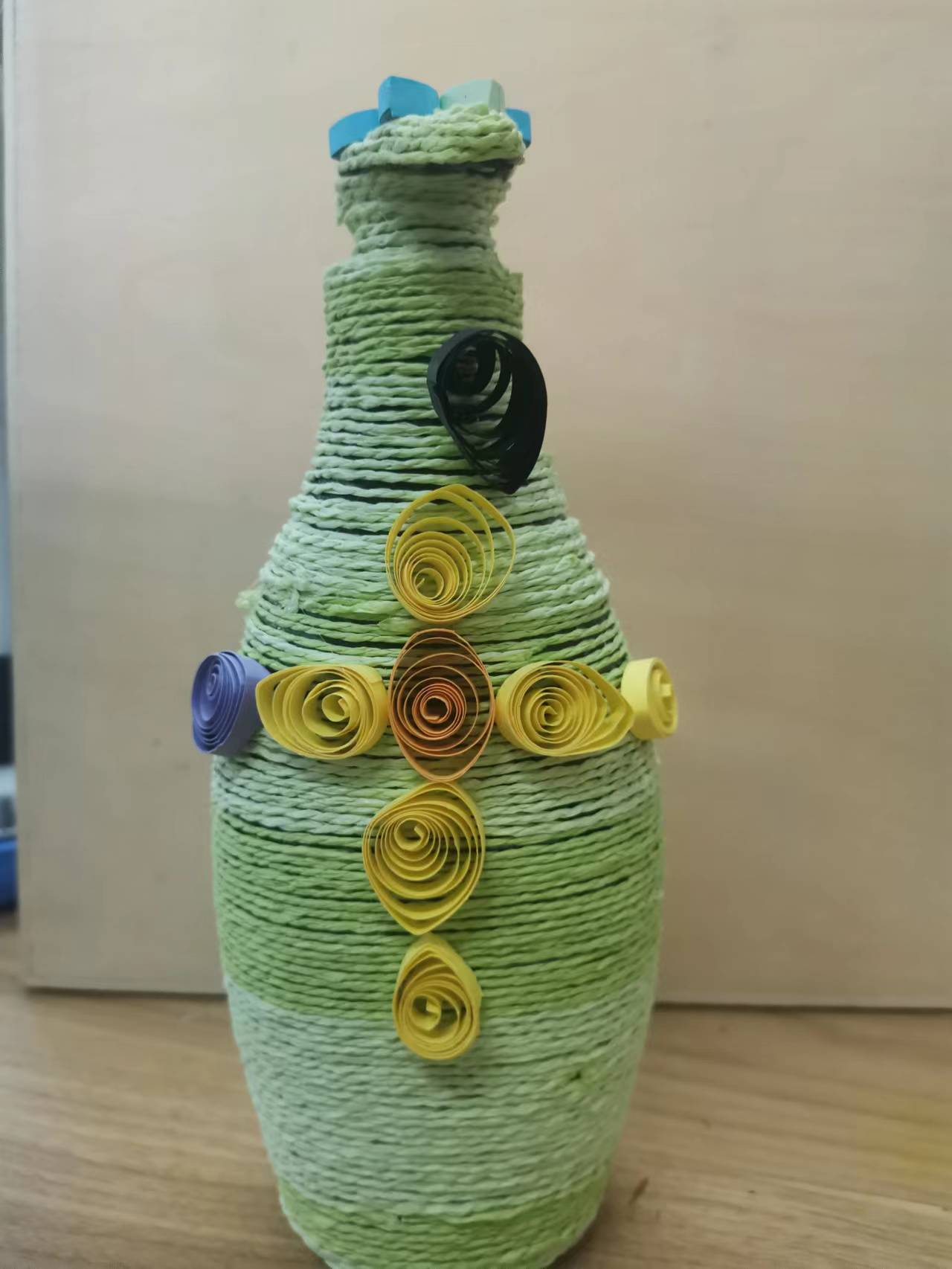 变废为宝,用完的废旧塑料瓶子:洗衣液、洗洁精、矿泉水瓶子都可以,先用皱纹纸搓成的绳子,接着一圈一圈的绕在瓶子上,最后用乳白胶粘牢固。再用衍低做上一些不同形状的花朵形状,粘贴好,一个美丽的花瓶就做好了,如果你喜欢的话,也可以这样做一做哟。