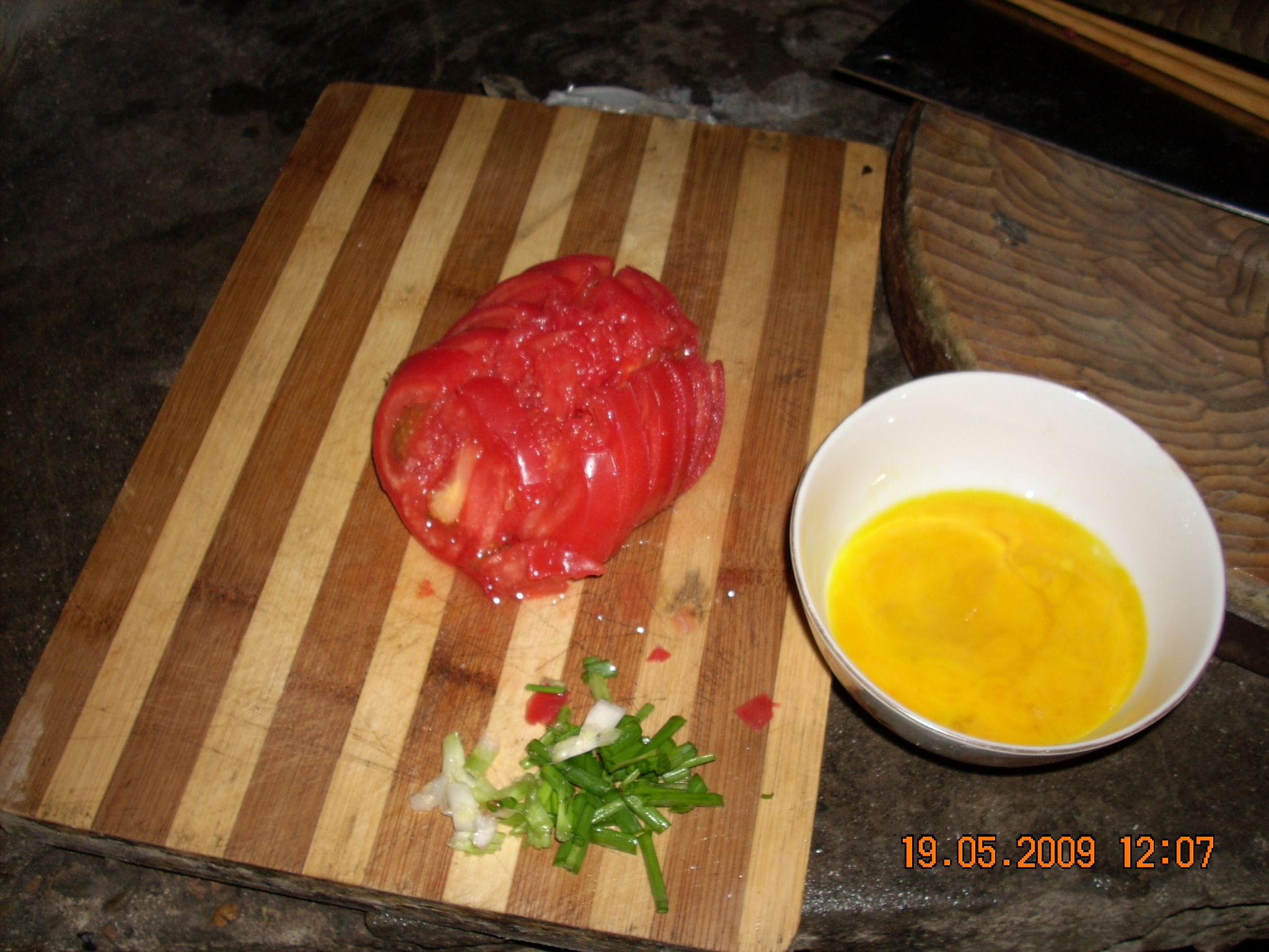 第一,把鸡蛋打碎在碗里,然后再加盐搅拌。把蕃茄洗净再切成片状,再把小葱切好。把这一切准备工作做好,就该准备下面的 工序了。