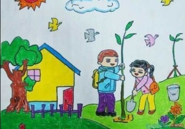 作品再现了植树的场景,号召大家积极行动,植绿护绿,保护环境人人有责。