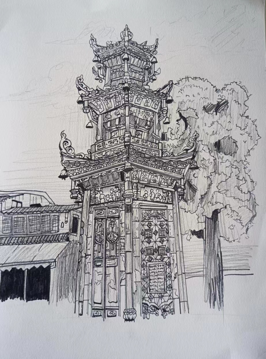 文风塔是我家乡的一个千年古镇——西来古镇的一个标志性建筑,它建于1833年。该塔为楼阁式砖塔,高13.6米,建筑面积为9.6平方米,塔基为六边形,塔身坐东北向西南,分为三级,上刻有“三英战吕布”等戏曲故事精美浮雕。1982年,它被评为成都市市级文物保护单位。