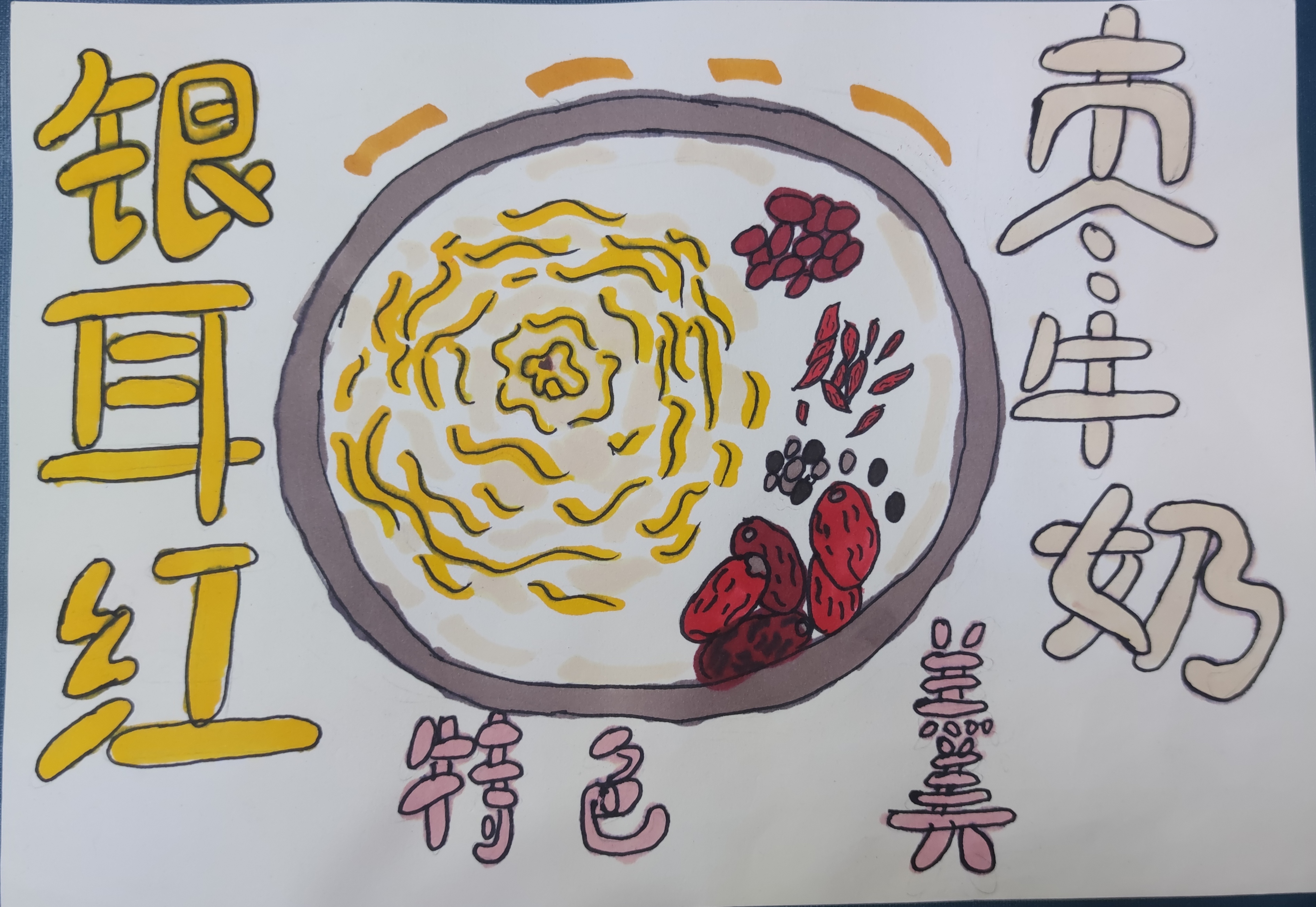 该作品画的是我家乡巴中的特产——银耳。银耳是很好的保健食物,可以做成银耳羹,银耳红枣牛奶羹是一种很受欢迎的甜品,具有滋阴润肺,养胃生津的功效。其中,银耳含有丰富的维生素,可以美容;红枣可以养心安神,补脾益气,适合心神不宁,失眠等症状的人群食用;牛仔能提供其他的营养成分。