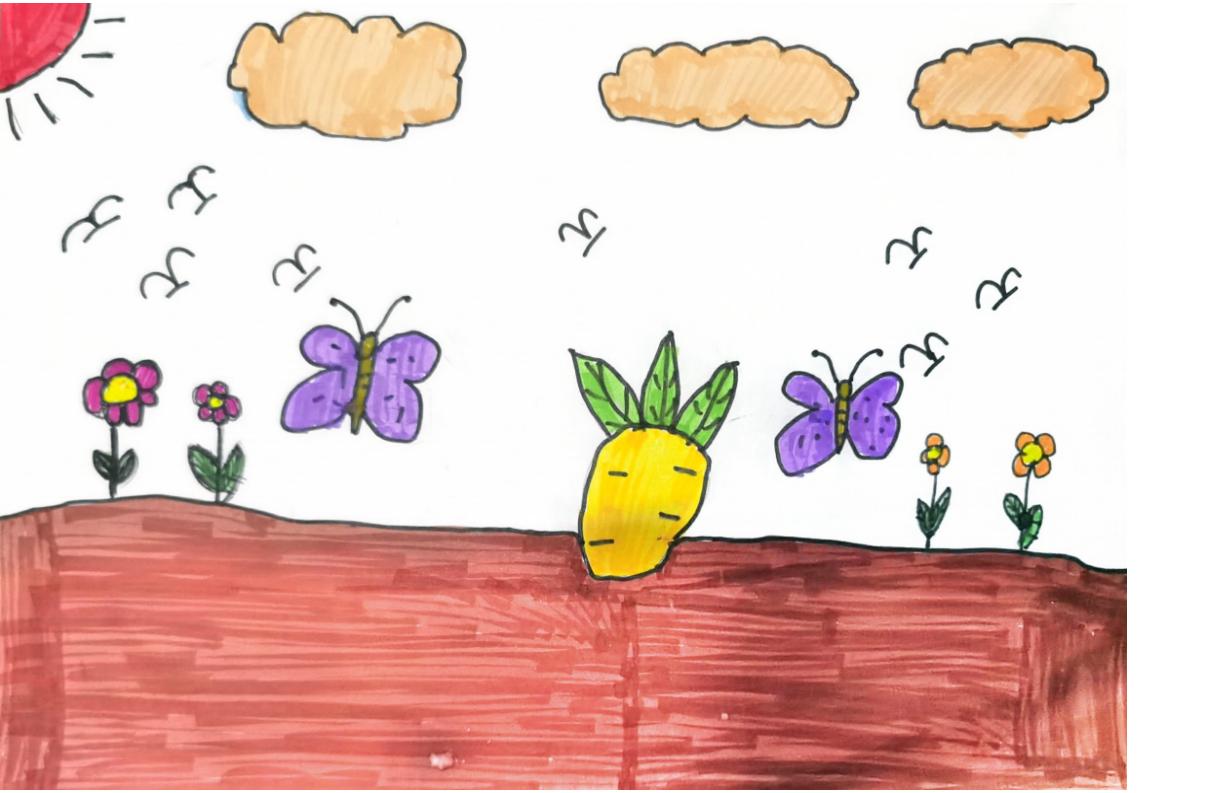 田园风景 一天,我漫步在萝卜地间。抬头仰望,天空湛蓝,一轮红日高悬,云朵被染上了淡淡的橙色。向前望去,几只黑雁在空中翱翔,紫蝴蝶在花丛中翩翩起舞。四朵色彩缤纷的花儿竞相绽放,绿叶映衬下更显娇艳。而那胡萝卜,身披黄袍,仿佛是大地的宝藏。不知为何,我情不自禁地为胡萝卜涂上了黄色,连那云朵也似乎想模仿,变成橙色的模样。这田园风光,真是美不胜收。