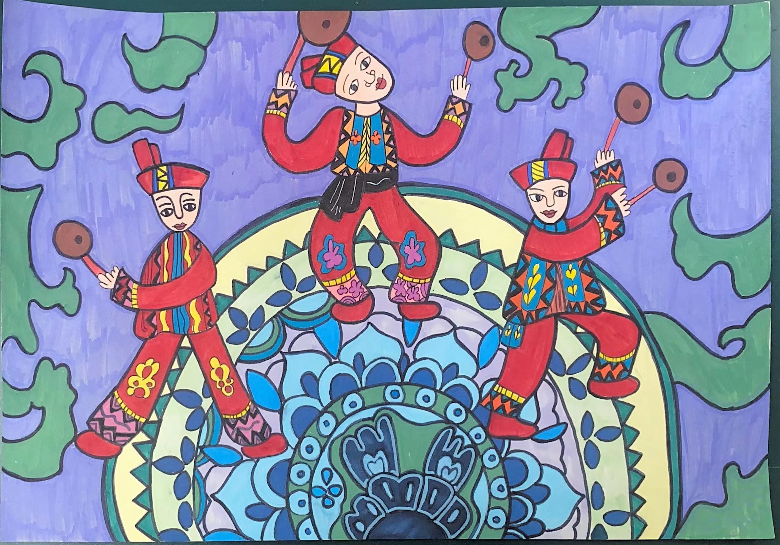 新中国成立后,为庆祝解放,一度更名为“翻山铰子”。从“短绳铰子”到“长绳铰子”,从“平地铰子”到“高台铰子”。2008年成为国家非物质文化遗产,在学校、广场、文化馆,不论是孩子、青年、还是老人都将其奉为珍宝,此时的“翻山铰子舞”不再是艺人的独享,而是人民群众奋进新时代的精神绽放。作品通过农民画的绘画形式展现。