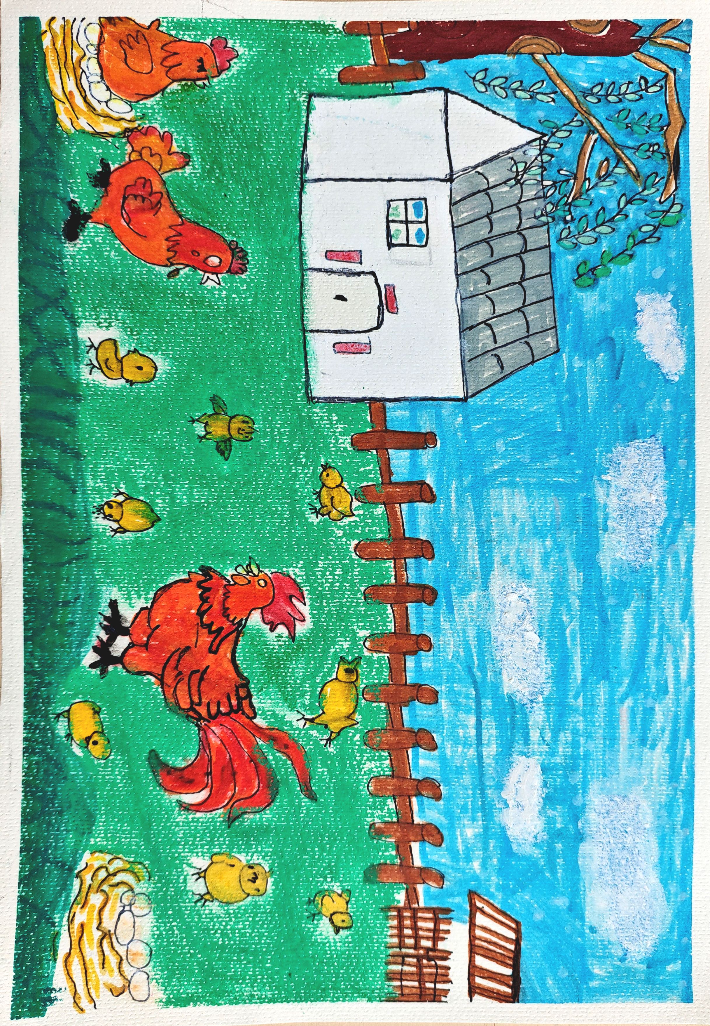 鸡,十二生肖之一,谐音“吉”,画鸡,喻意着吉祥如意,大吉大利。小画家用儿童的视角为我们展示出一副温馨和谐的小鸡家庭图。你看,图中有绿绿的草坪,一排排栅栏,白色的房子,高大的树,远处的蓝天白云。草坪上,鸡妈妈和鸡爸爸好像在互相商量着什么,小鸡宝宝们有的在专心的寻找着事物,有的则自由自在的奔跑嬉闹,他们多快乐啊。你看,鸡窝里那么多鸡蛋,母鸡们真的很勤劳,夸夸它们吧,小伙伴们,赶紧捡鸡蛋去吧。