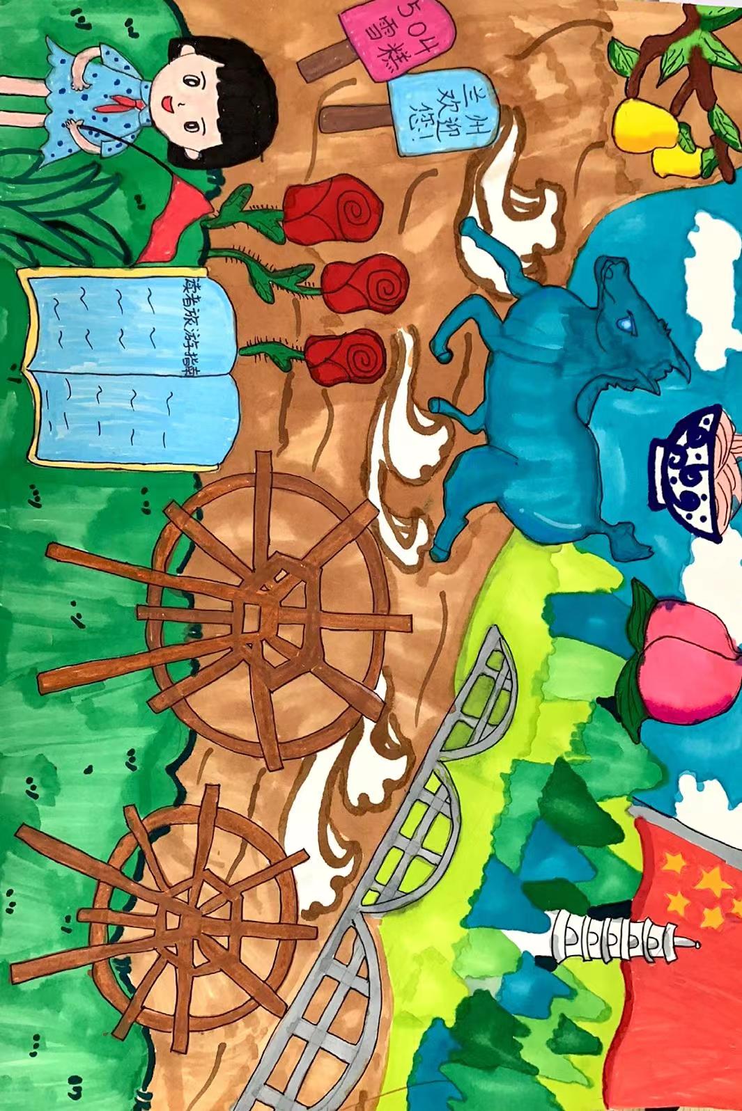 这幅画的创作理念融合了兰州的地方特色与儿童的想象力,右侧的黄河与绿色土地,分别代表兰州的多样地貌和丰富的农业资源。大水车则是对兰州古老灌溉方式的致敬,展示了兰州人民的智慧和勤劳。展现了兰州独特的地方特色和深厚的文化底蕴。