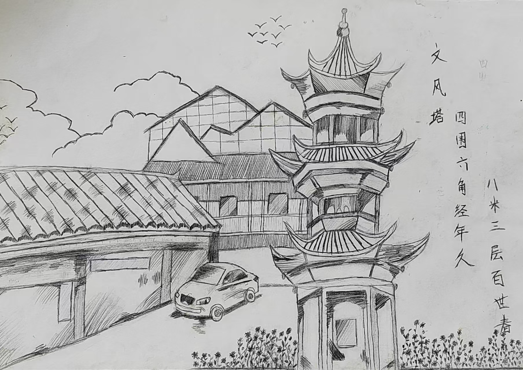在蒲江县西来古镇,有一栋特有的文化建筑,他就是著名的文风塔。文风塔高约20米,分3层,外加宝顶,塔身成六棱状,每一层都是飞檐走角。塔身四周是古典戏曲雕塑,并配有用九曲篆文书写的诗文,此乃世间少有。在文风塔周围的古街上,时不时有小车驶过,成了当地古今融合的一道靓丽风景。