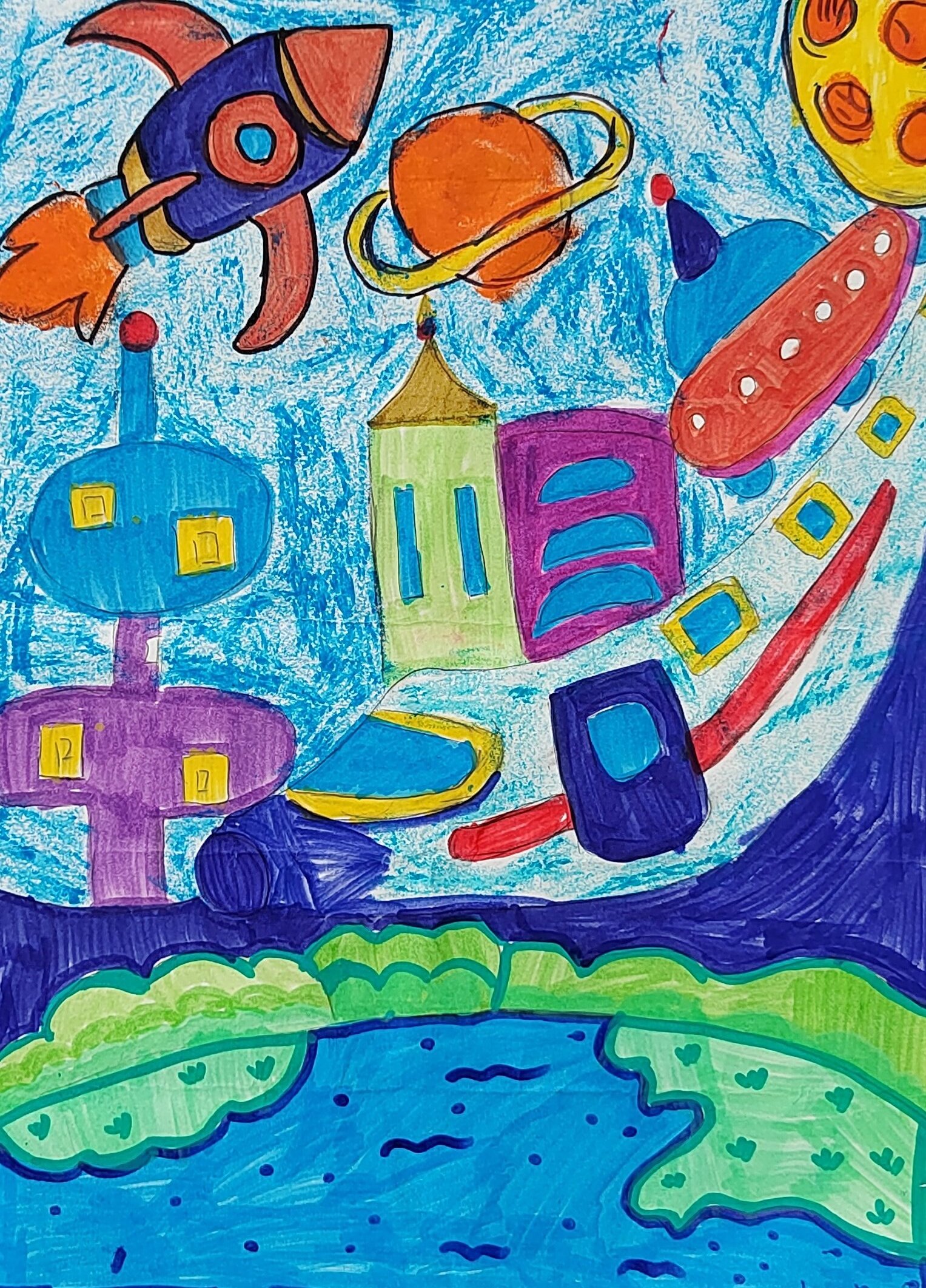在未来世界,到处都有造型独特的建筑,色彩丰富又别致,还有火箭、飞船等航天器在天空自由穿梭。周围环绕着各种星球,仿佛人类已经拥有开展星际探索与自由旅行的能力。地面上,河流潺潺,岸边绿意盎然,整体营造出一种科技与自然和谐共存的美好氛围。