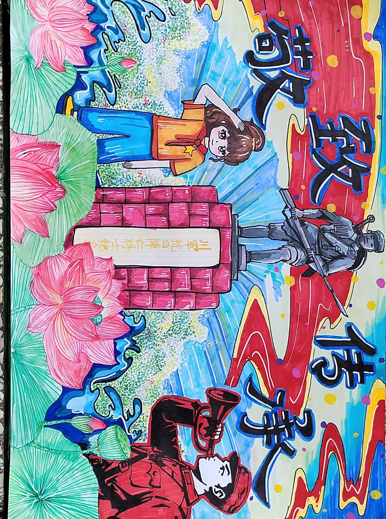 在我们西来镇,有一座成都战役纪念馆,他以"川军抗日阵亡将士纪念碑"为核心,周围有成都战役博物馆,阵亡将士陵园等建筑。在烈士陵园正面,有一座浮雕,浮雕上吹号角的红军战士,传递着不畏牺牲,英勇奋进的精神,在红军战士后面,有一面战旗,光芒万丈,寓意英烈精神将照耀整个世界。现在幸福的我们,要传承红色基因,铭记先辈精神,砥砺前行,建设我们强大的新中国。