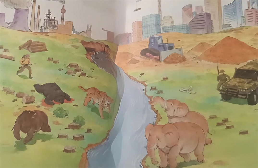 工业文明的钢铁森林与机械巨兽,是人类理性僭越自然的 "具身化" 呈现,烟囱吞吐的烟云、推土机翻搅的土丘,如同文明熵增的具象化蔓延,不断侵蚀着本就脆弱的生态肌理。 而动物们的挣扎与迁徙,实则是自然对人类 "存在论暴力" 的无声抗诉。河流作为生命脐带,却成为文明与野性的分割线,此岸是人类对资源的贪婪攫取,彼岸是生命对家园的绝望逃离,这种空间区隔暗合着人类中心主义与生态整体主义的哲学分野。 在地球这个生命网络中,人类与其他生命实乃命运共契的 "共生存在",任何对自然的戕害,本质都是对自身存在根基的消解。