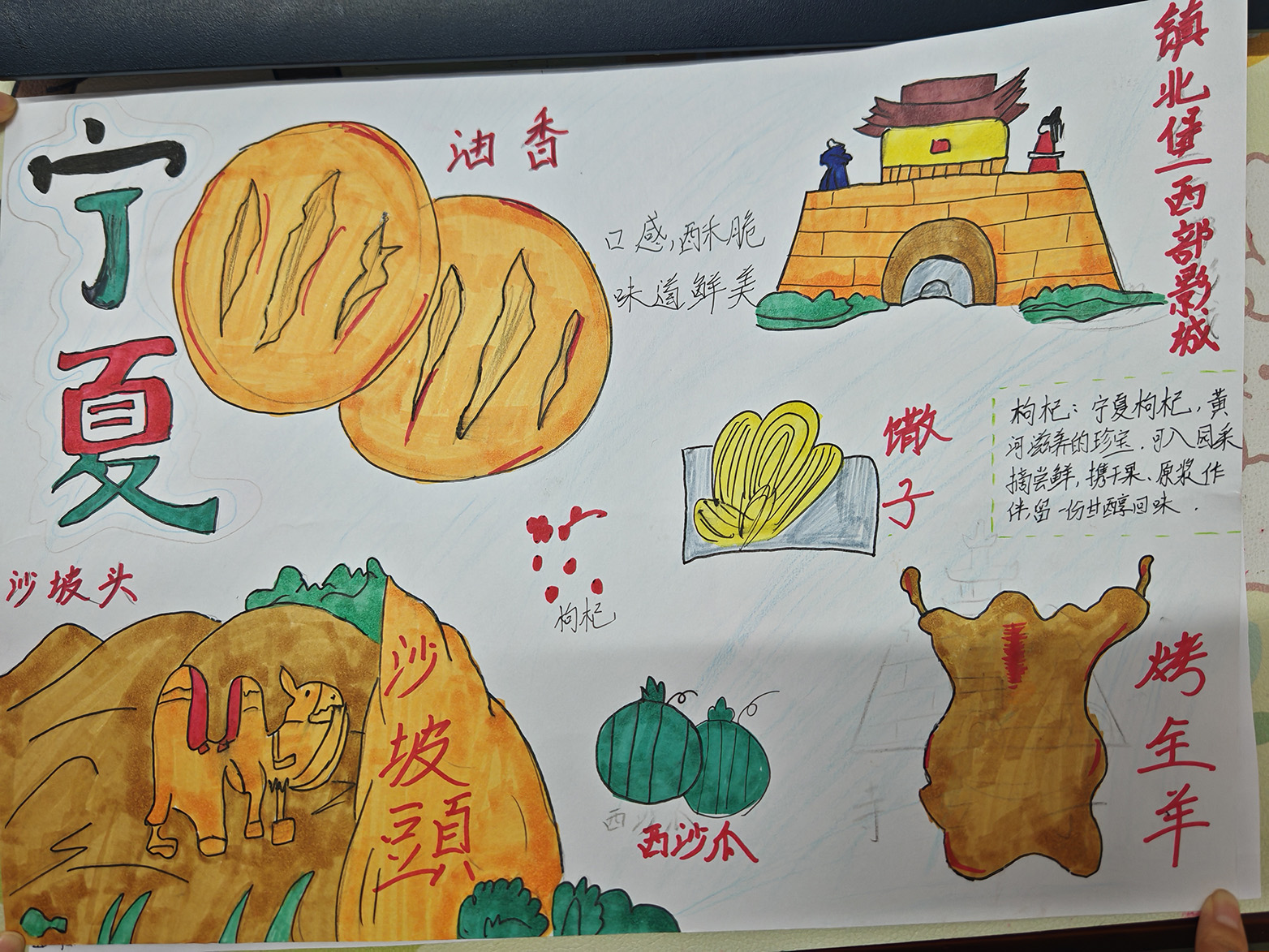 宁夏有很多特色美食,就如沙西瓜,烤全羊,油香,还有许多特色的地点,就如沙坡头....沙西瓜是宁夏人最喜欢吃的,沙西瓜吃起来口感出众,脆甜脆甜的,汁水丰富,让人吃了一块还想吃,色泽鲜红,外皮浅薄,果实饱满,这样好吃的脆甜的西瓜,让宁夏人常常买很多往家里进。油香是我们宁夏人每次在过古尔邦节或开斋节时必做的一道食材,平时也可以在家做,色泽鲜艳口感吃起来软软的,外皮酥脆,加上饱满的馍芯,吃起来脆香脆香的,让人吃了一个后还想吃好几个,还想往家里带一些,沙坡头,当你去了这个地方后,你会被那里的景色震惊,宁夏还是有许多好地方。但去了沙坡头的人似乎对其他地方都不感兴趣了。