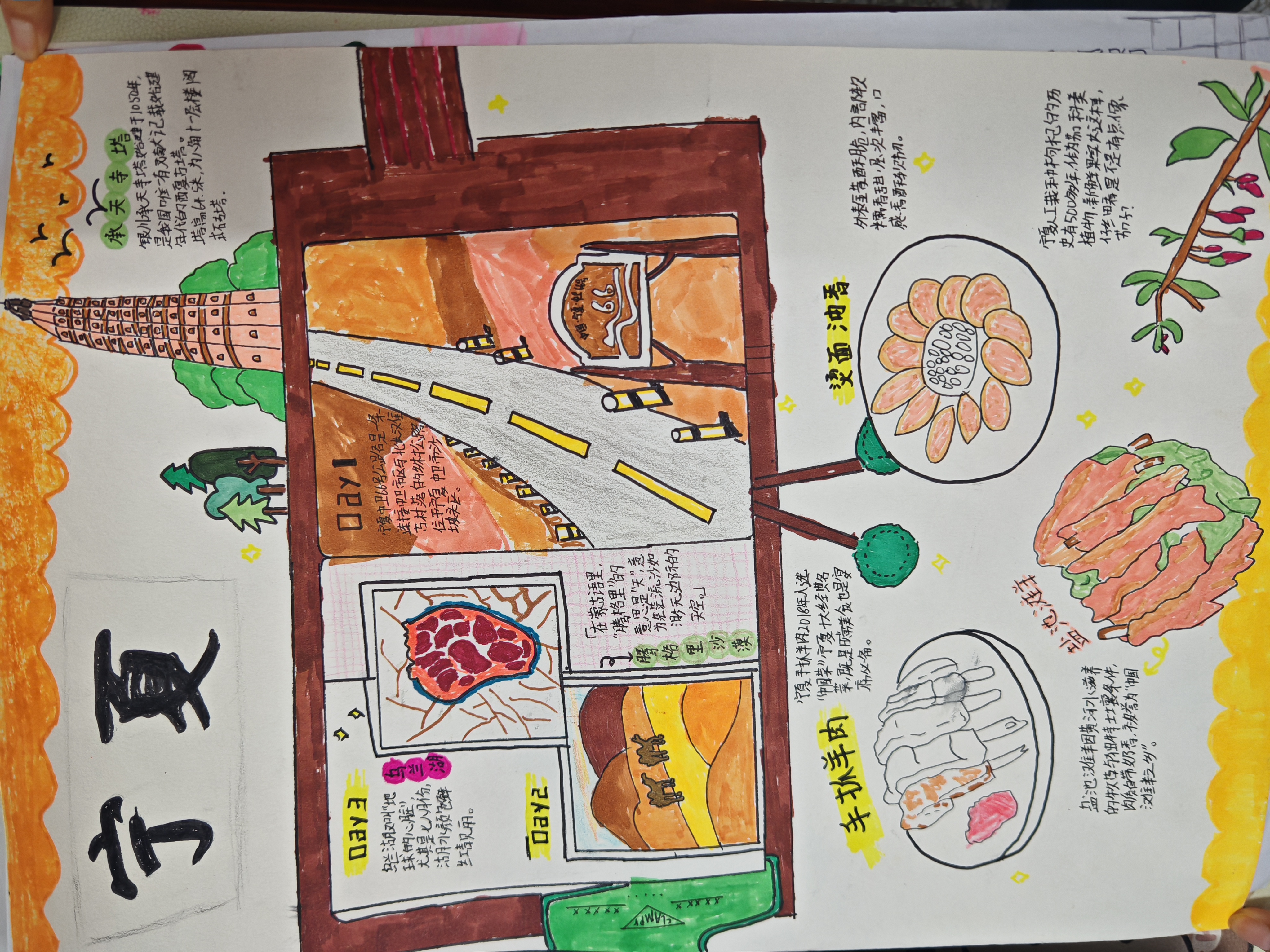 宁夏特色名下有许多特色展现在我的画中,例如宁夏的手抓羊肉,枸杞炸油香沙西瓜的美食都受人们欢迎,手抓羊肉是宁夏地区特色。热气腾腾的肉香气十足,枸杞是我们宁夏地区特色种植枸杞的工厂有许多,每到夏天农民们就开始摘枸杞大片的枸杞地有许多的水管来灌溉枸杞。红柚柚的枸杞挂在树上,压的树枝掉下来令人向往。炸油香是我们回族的美食,每到特定的日子就会炸油香油香酥酥脆脆的,吃过的人都会赞不绝口沙坡头是宁夏的旅游。景点之一,受到许多人的欢迎,这就是宁夏的特色。