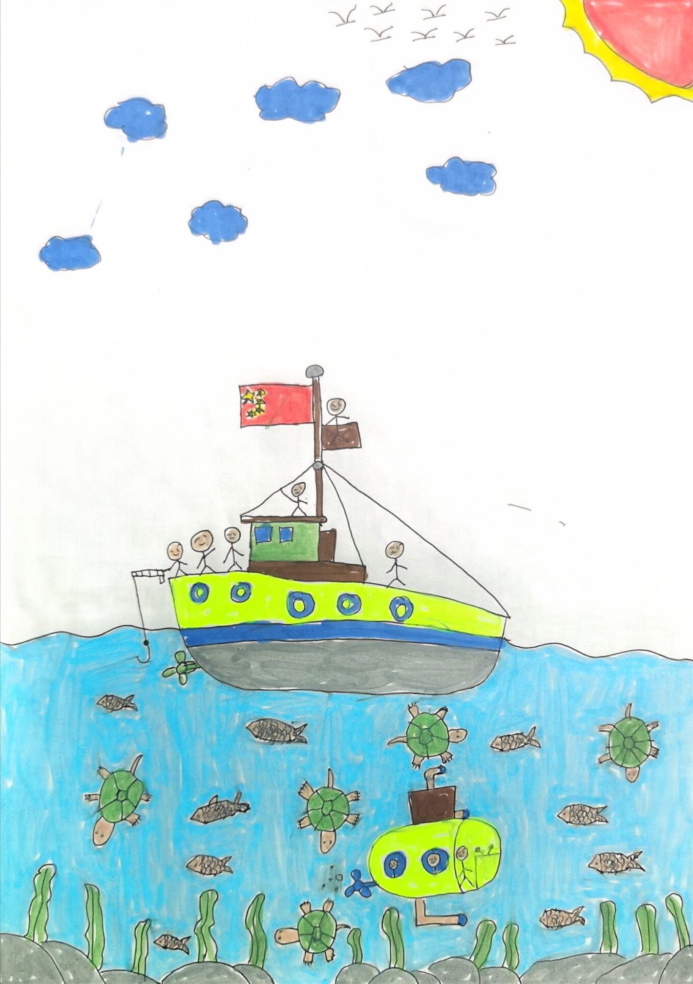 大家好!我画的是《海洋探索环保小舰队》。你看,海面上有挂着国旗的大船,海里有潜艇,还有好多小鱼、海龟在游呢。海洋是好多生物的家,我们要保护它,不乱扔垃圾、不污染海水。只有保护好海洋,小鱼海龟才有家,我们也能一直看到这么美的海底世界。欢迎大家和我一起当海洋环保小卫士,保证你们会爱上这片需要我们守护的蓝色家园哦!