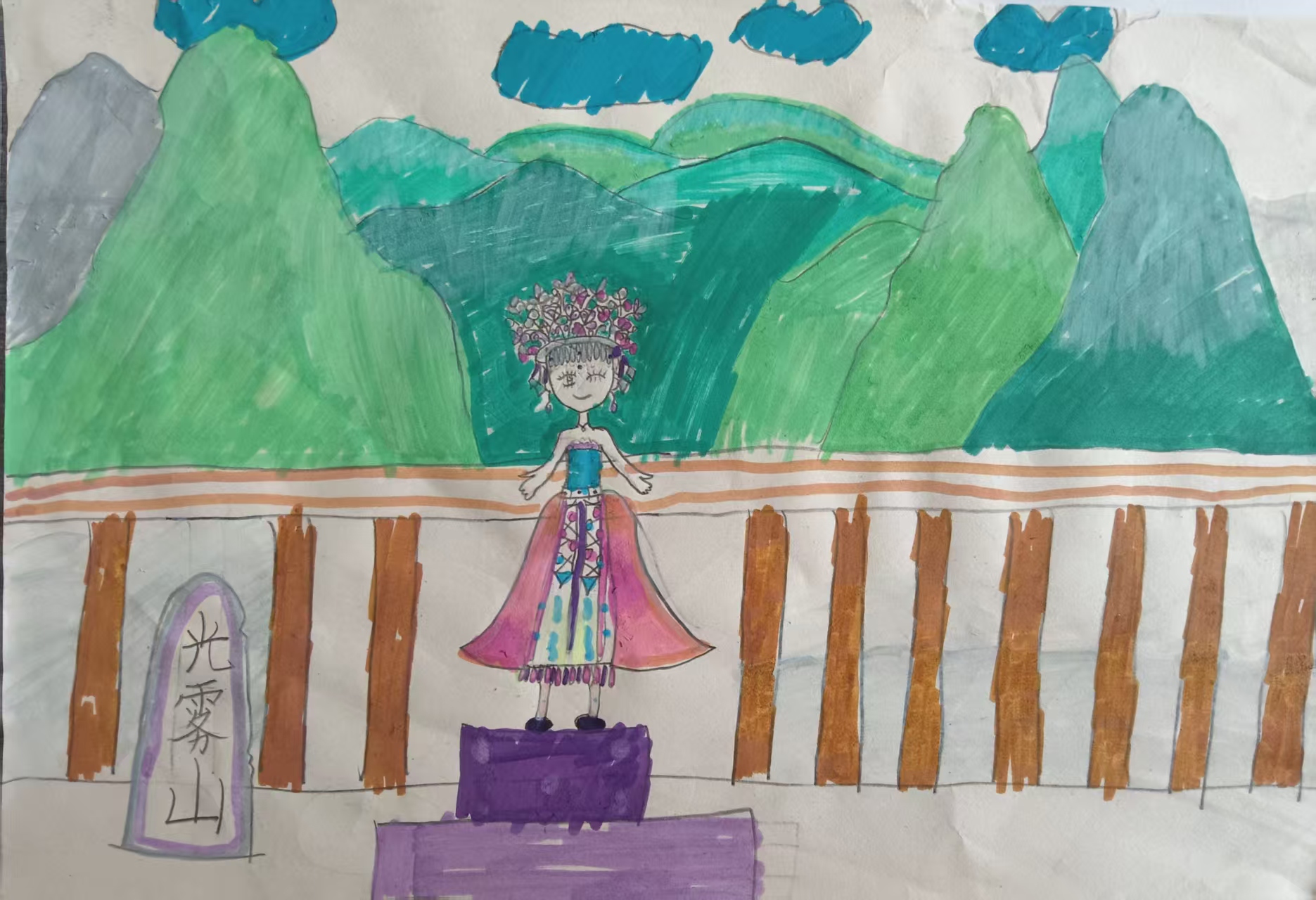 这是我画的光雾山!四川巴中的光雾山,山上的树有的绿油油的,有一些树的树叶变红了,云像棉花糖飘在山顶。我把自己画在最中间,穿的民族衣服有好多彩色花纹,袖口还绣了小花。这是我最开心的旅行记忆,我想把和光雾山的合照永远画下来!