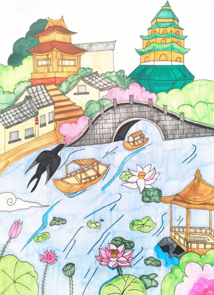 大家好!我画的是《江南水乡美如画》。江南的水乡可美啦,有弯弯的小桥,清清的河水,河上飘着小船,岸边是古色古香的房子,还有好看的塔。水里开满了粉色的荷花,还有小燕子飞来飞去。江南就像一幅漂亮的画,要是有机会,我好想去江南旅游,看看真实的水乡,也希望大家能去感受江南的美!