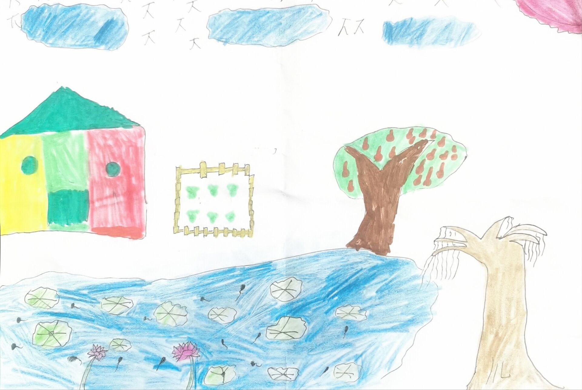 大家好!我画的是《水乡小村乐趣多》。这个小村子旁边有清清的河水,河里有荷叶、荷花,还有小蝌蚪游来游去。岸边有彩色的房子,还有结满果子的树。来这儿旅游可好玩啦,能在河边看风景,还能观察水里的小动物,就像走进了美丽的大自然。希望大家都能来这个可爱的水乡小村,玩得开开心心!