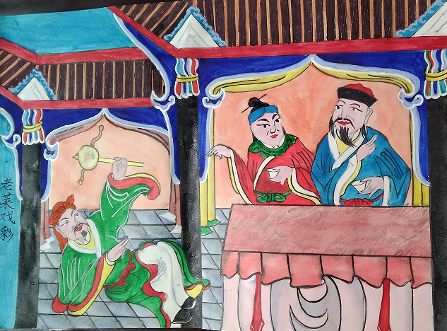 一天,老莱子为父母取浆上堂,不小心跌了一跤。他害怕父母伤心,故意装着婴儿啼哭的声音,并在地上打滚。父母还真以为老莱子是故意跌倒打滚的,笑着说:"莱子真好玩啊,快起来吧。" 老莱子用他的纯真和孝心,为父母营造了许多欢乐时光。这份孝心如同温暖的阳光,照亮了家庭,也让"老莱娱亲"的故事流传千古,成为子女孝顺父母的典范。