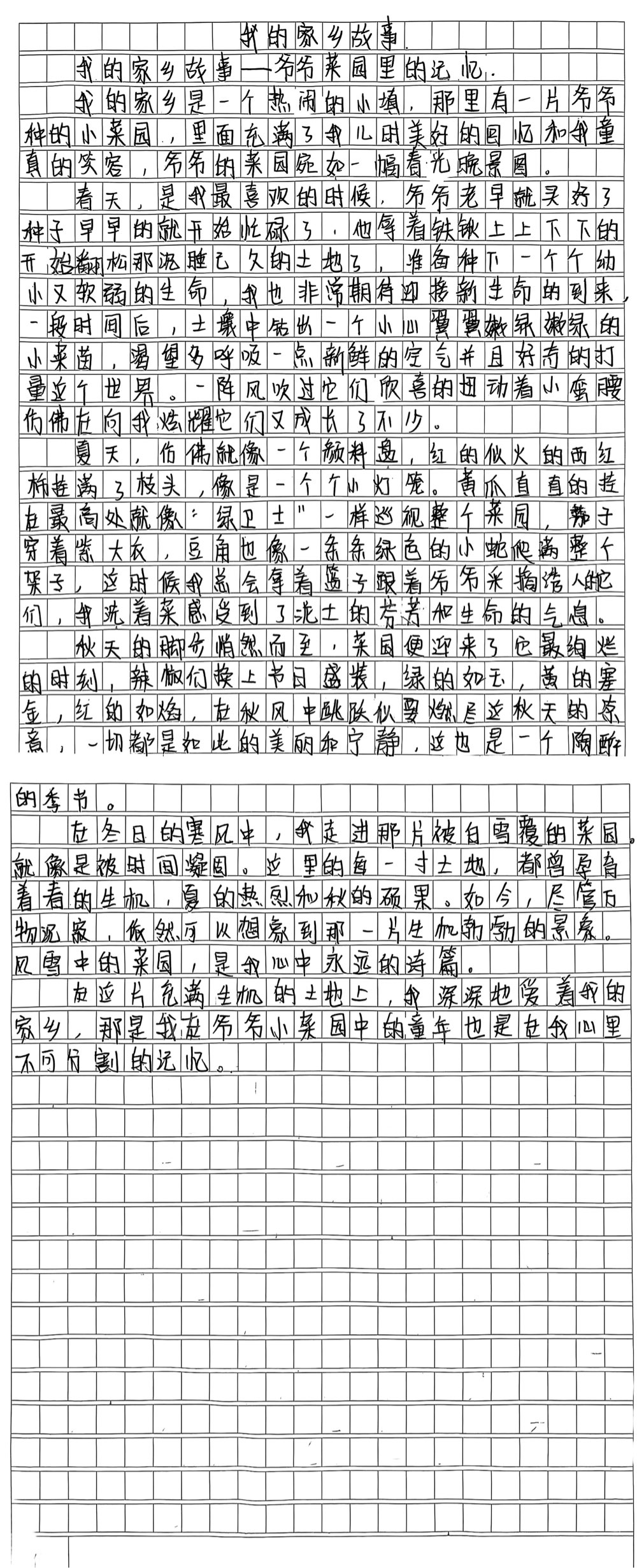以爷爷的小菜园为叙事核心,构建“四季景观+童年记忆+情感传承”的三层创作逻辑: 四季景观层:通过春天松土育苗、夏天果蔬缤纷、秋天辣椒绚烂、冬天雪景凝思的四季变化,将菜园塑造为充满生机的自然画卷,展现乡村土地的季节韵律。 童年记忆层:串联爷爷耕种、“我”盼菜苗成长、跟着爷爷采摘等生活细节,把菜园转化为童年欢乐与亲情联结的场域,让个人成长与土地劳作深度绑定。 情感传承层:将菜园升华为家乡情感的象征,它承载着童年的纯真笑容与对土地的热爱,即便冬日沉寂仍能唤起往昔的蓬勃景象,最终落脚于“菜园是乡愁的诗意载体,是童年记忆与家乡情怀的永恒寄托”,诠释其在精神层面的独特价值。