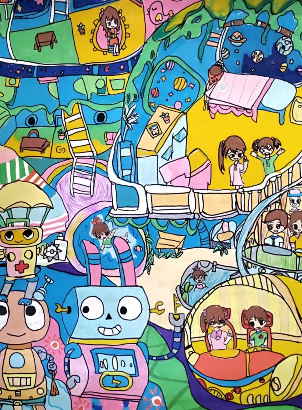 在星际社区,科技交织出一副梦幻生活情景。 画面里,色彩斑斓的建筑融合太空与童话风格,有悬浮居所、环形栈道,处处可见星星、行星。画面中有各种可爱机器人,有医疗机器人,有清洁机器人,大人们陪伴孩子们在球形汽车里穿梭、在水里嬉戏、在游乐园露台上欢笑。这里是未来人们的社区,建筑可随心意变换,机器人能满足人们不同需求,星际交通自由便捷。 整副画色彩明快、造型奇趣,展现了"科技服务人类,人们在科技领域自由探索、快乐生活"的画面。
