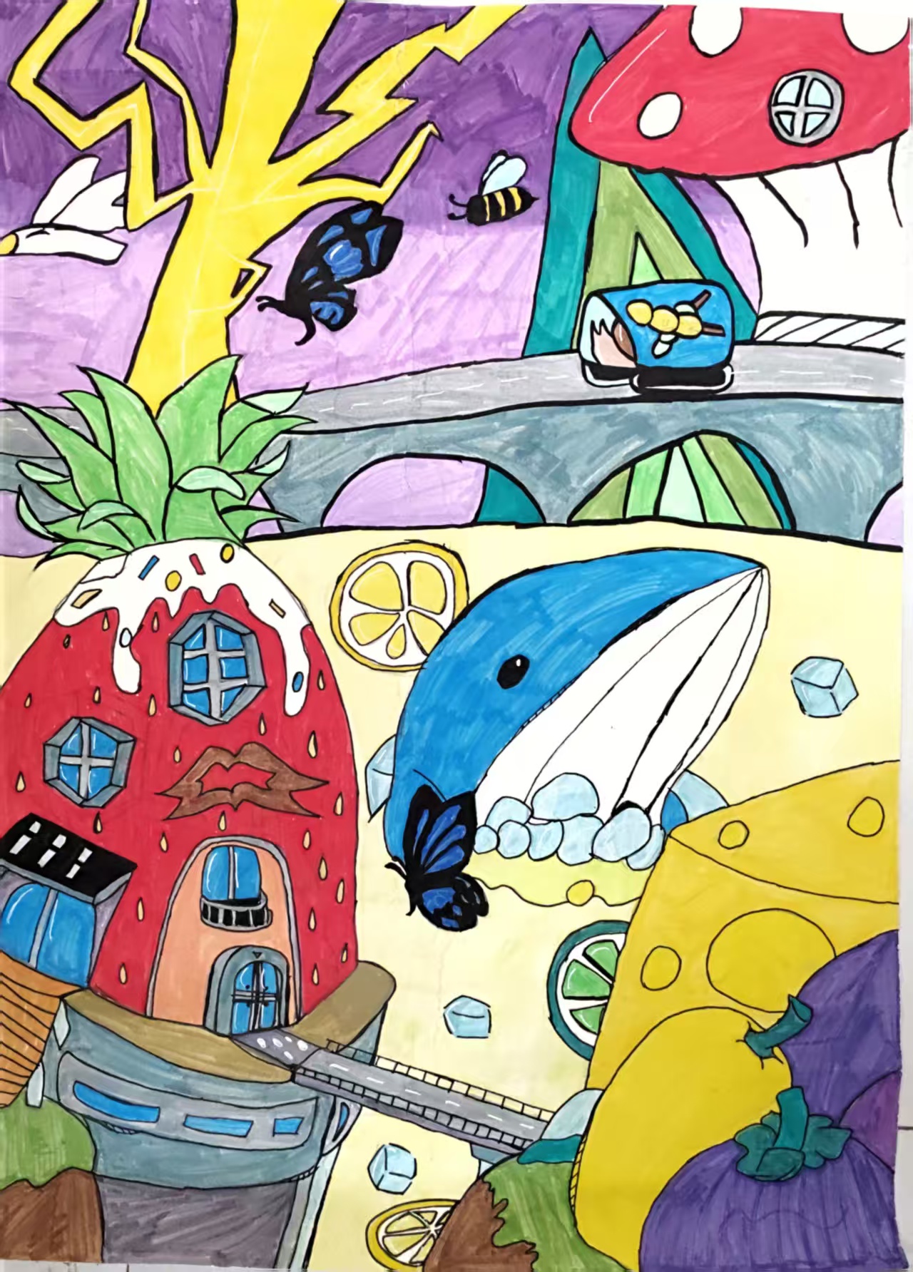 这幅画是一个以美食著称的世界。图中的草莓冰淇淋屋、蘑菇居所、奶酪山丘等食物建筑充满了美食香味,蓝鲸高兴得在柠檬与冰块间嬉戏,它就是美食星球的"守护者"。 空中桥梁上,载着美味蜂蜜的汽车穿梭往来,蝴蝶、蜜蜂在植物间忙碌着,黄色闪电状树木与紫色天空营造出科幻氛围。这颗星球的生命以食物为家园,高科技与自然美味完美融合,展现了一个奇幻美食乐园,作者传递出对未来生态与科技共生的美好愿想,让我们在色彩与创意中感受科幻世界的美味与神奇。
