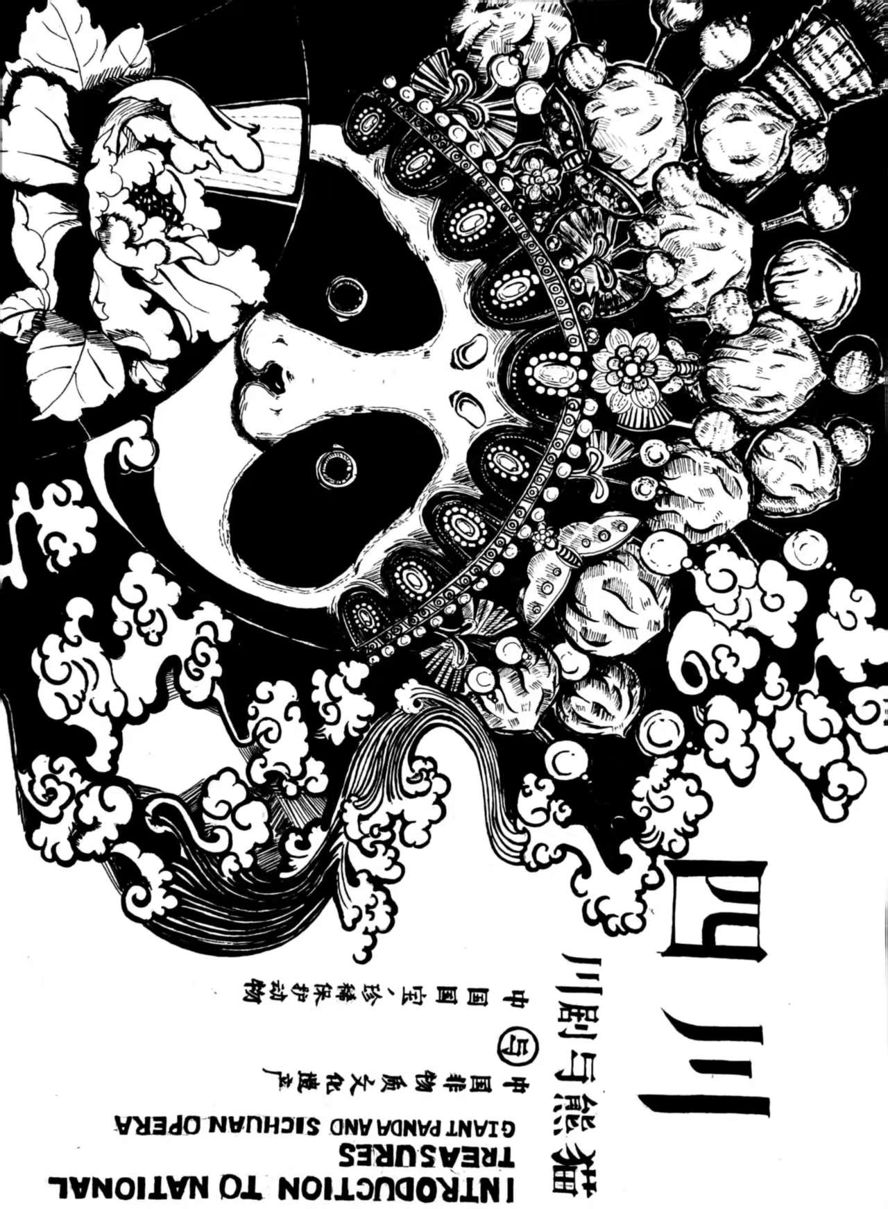 画面主体有川剧与熊猫,整上以黑白色调为主,又用文字与图画相结合的方式绘就。这幅画的灵感来自于我的家乡常用川剧变脸来庆祝重大事项,如婚庆和过生日等。熊猫在我们四川人的印象中也是十分可爱,同时它也是四川的一个特色所在。于是我便将二者结合绘就了这幅画。