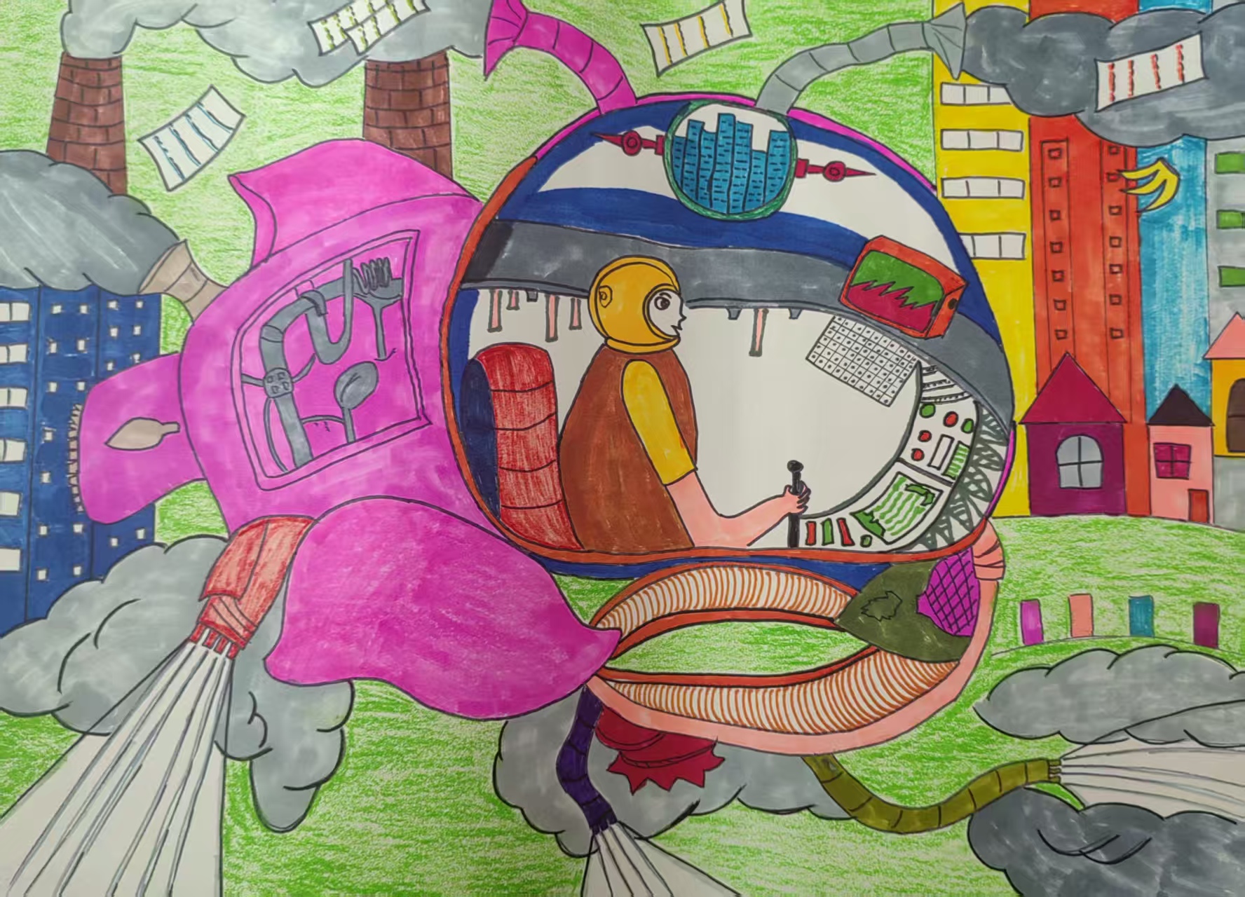 这幅画是我心里"未来环保"的样子!我想象未来有艘神奇的太空清洁船,就像超级大的"空气洗衣机"。