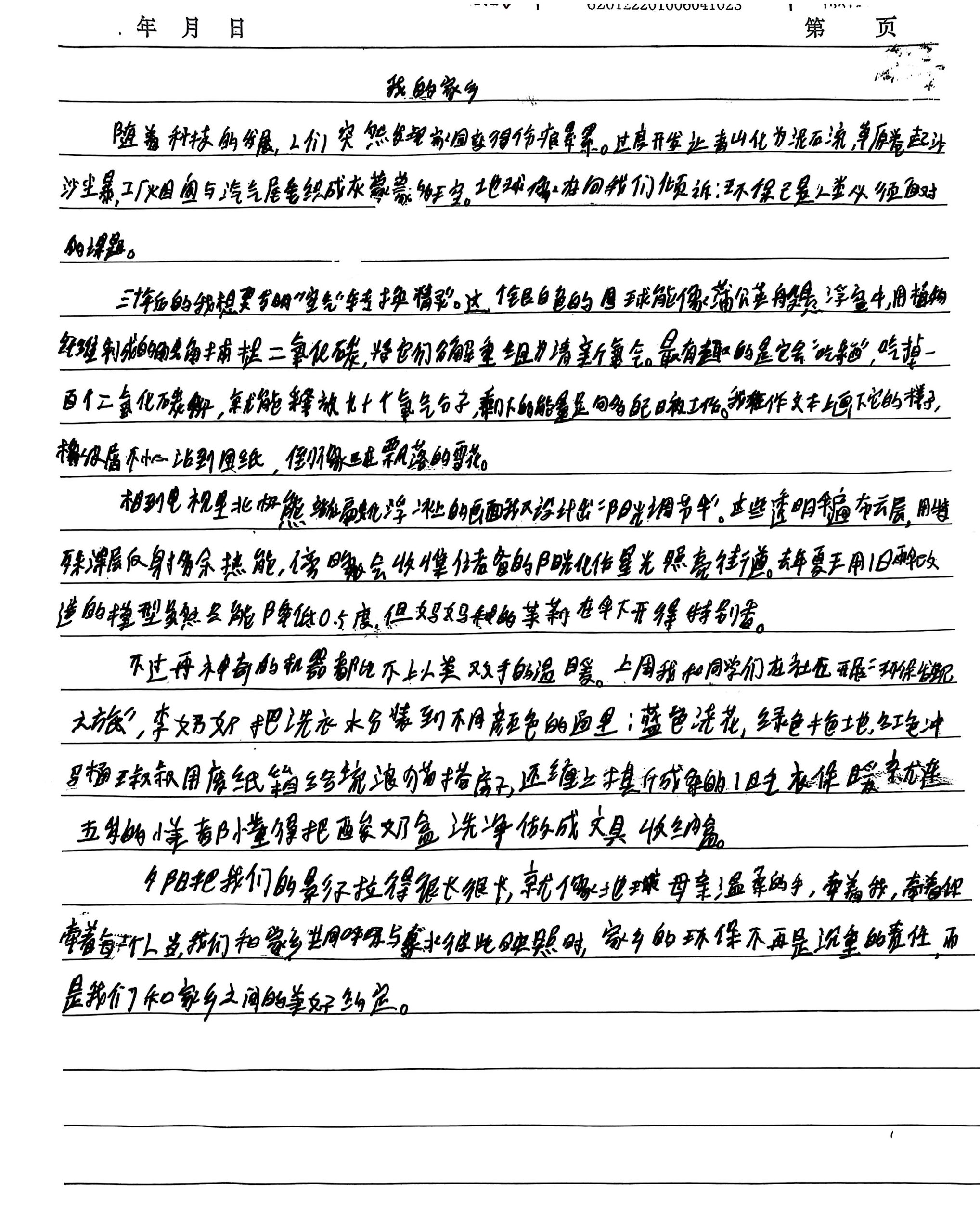 我写《我的家乡》,是想聚焦家乡环境的变化:从过度开发带来的污染,到科技与人力共护环境的新貌。我既想记录曾经的生态困境,也想通过“空气净化球”等想象中的科技,还有社区里分类洗衣水、变废为宝的日常行动,传递“环保不是负担,是与家乡的温柔约定”的想法。希望以文字唤起对家乡生态的珍视,让“人与家乡共生”的暖意,成为联结彼此的纽带。