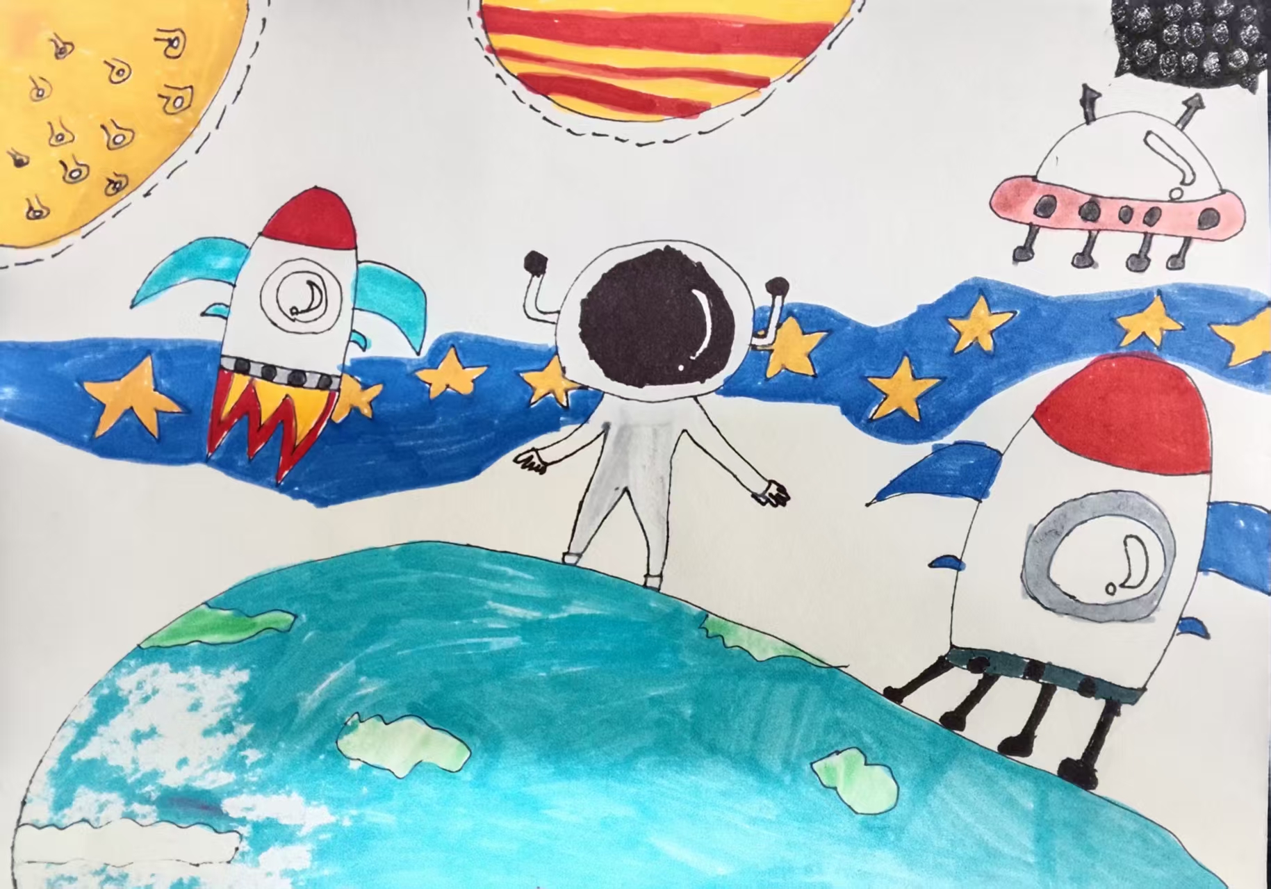 我居住在地球上,地球是一颗蓝色的星球。在学校的图书角里,我还读到,土星的光环像彩色甜甜圈,闪闪的星星撒满天,突然冒出个圆脑袋外星人......真有趣,原来太空不是黑黑的。我要好好学科学,长大后坐飞船去探索太空的秘密!