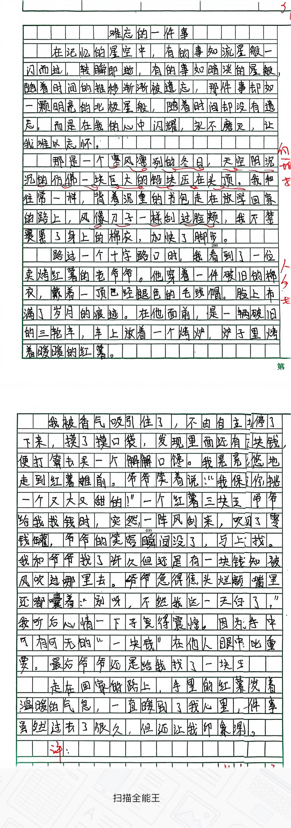 这篇《难忘的一件事》创作,以冬日买烤红薯的经历为载体,通过环境描写(寒风、阴沉天空)烘托氛围,刻画卖红薯老爷爷的形象与细节,展现生活中平凡人物的不易与坚守。借“一块钱”的风波,引发对生活艰辛与善意的思考,以小见大,让读者在平凡叙事中感知人间冷暖,同时用生动的场景与心理描写,使故事具有代入感,让“难忘”的情感内核自然流露。