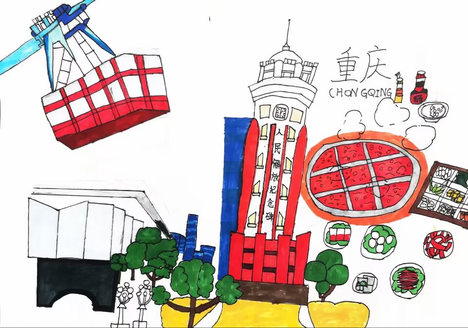 大家好!我画的是《重庆欢乐游玩大集合》。重庆可好玩啦,有超酷的长江索道,高高的人民解放纪念碑,还有辣乎乎的火锅和好多好吃的。每次想到重庆这些,就觉得超开心。欢迎大家来重庆,坐索道,逛解放碑,吃火锅,保证你们玩得吃得多开心!