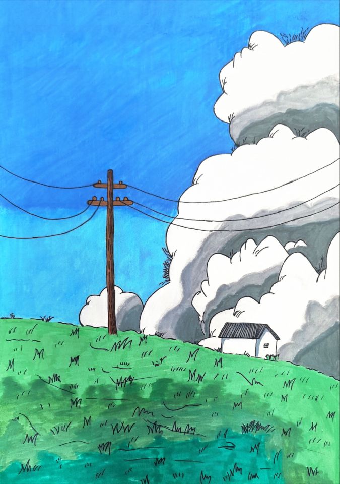 大家好!我画的是《原野云下宁静屋》。你看,绿绿的原野上有座小房子,旁边的电线杆立在那,天上的云大大的,蓝天蓝蓝的。在这里,感觉世界都安静了,超舒服的。每次看到这样的画面,就想在原野上跑一跑。欢迎大家来这原野看看,看看大云朵,看看小房子,保证你们会喜欢这宁静的美哦!