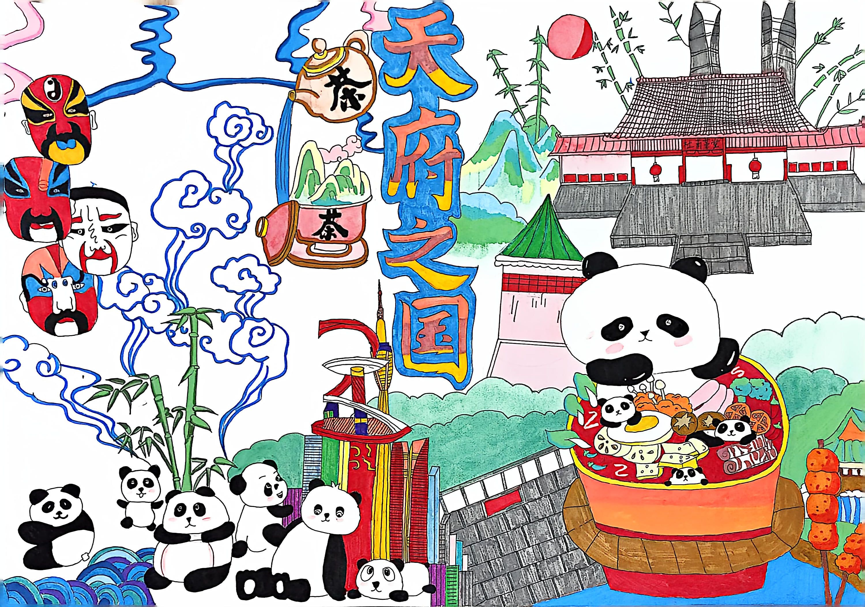 这幅画作将 "天府之国" 的灵秀与丰饶铺展成卷:画面里,川西平原沃野千里,金黄稻田翻着麦浪,岷江碧水蜿蜒其间,滋养着两岸青绿;远处峨眉山云雾缭绕,青城山黛色连绵,尽显山河之韵。 田间农人躬身劳作,竹屋旁大熊猫抱笋憨坐;市集一角,红油火锅腾着热气,锅盔、糖油果子透着烟火气。暖柔笔触勾勒出自然生机与人文烟火,既显天府的物产丰美,又藏川蜀的灵动风情,满是对这片土地的深情赞颂。