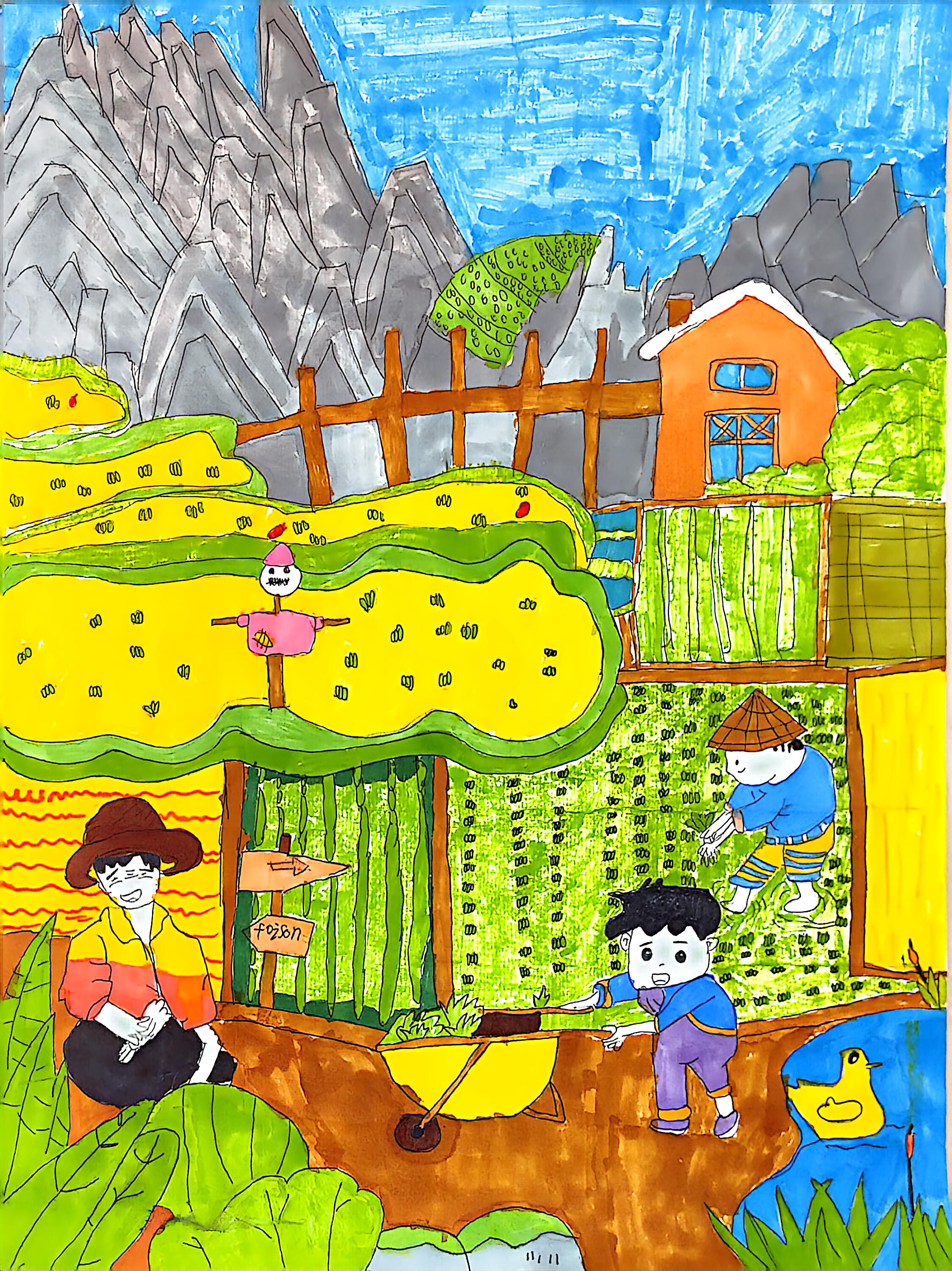 这幅画作定格归乡所见的淳朴日常:远山含翠,田垄铺展,几位农民躬身田间,一手握秧苗、一手轻插,泥水溅起细碎涟漪,动作娴熟而专注。 画面一角,“我” 立于田埂,身影带着城市归来的轻缓,静静望着劳作场景,目光满是对家乡自然与烟火的眷恋。暖色调笔触勾勒出田野的生机、农人 的勤恳,将归乡后感受到的淳朴气息与故土温情融于画中,满是对家乡的深切共情。