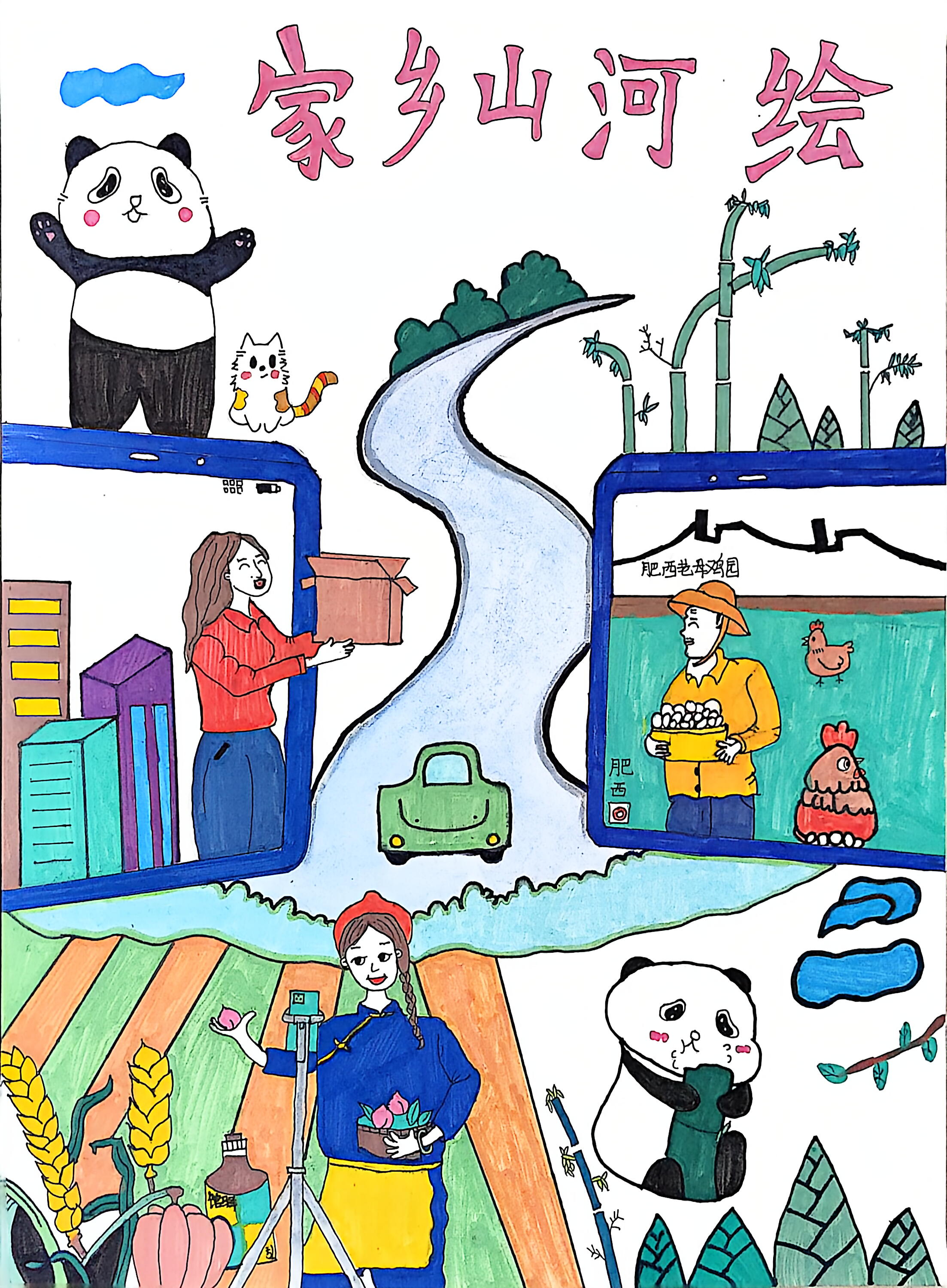 这幅画作以明快鲜活的风格,铺展科技助农与熊猫相伴的趣景:金色稻田里,无人收割机轰鸣作业,履带碾过稻穗留下整齐轨迹;田垄旁,光伏灌溉桩闪着金属光泽,水流顺着智能管道滋养禾苗。 几只大熊猫成了 "农间萌客"—— 有的趴在收割机旁,爪子轻碰机身;有的抱着刚成熟的稻穗,憨态引得田间农人笑意盈盈。鲜亮色彩搭配灵动笔触,让科技的现代感与熊猫的萌趣、农田的烟火气相融,鲜活呈现蜀地乡村的新生机