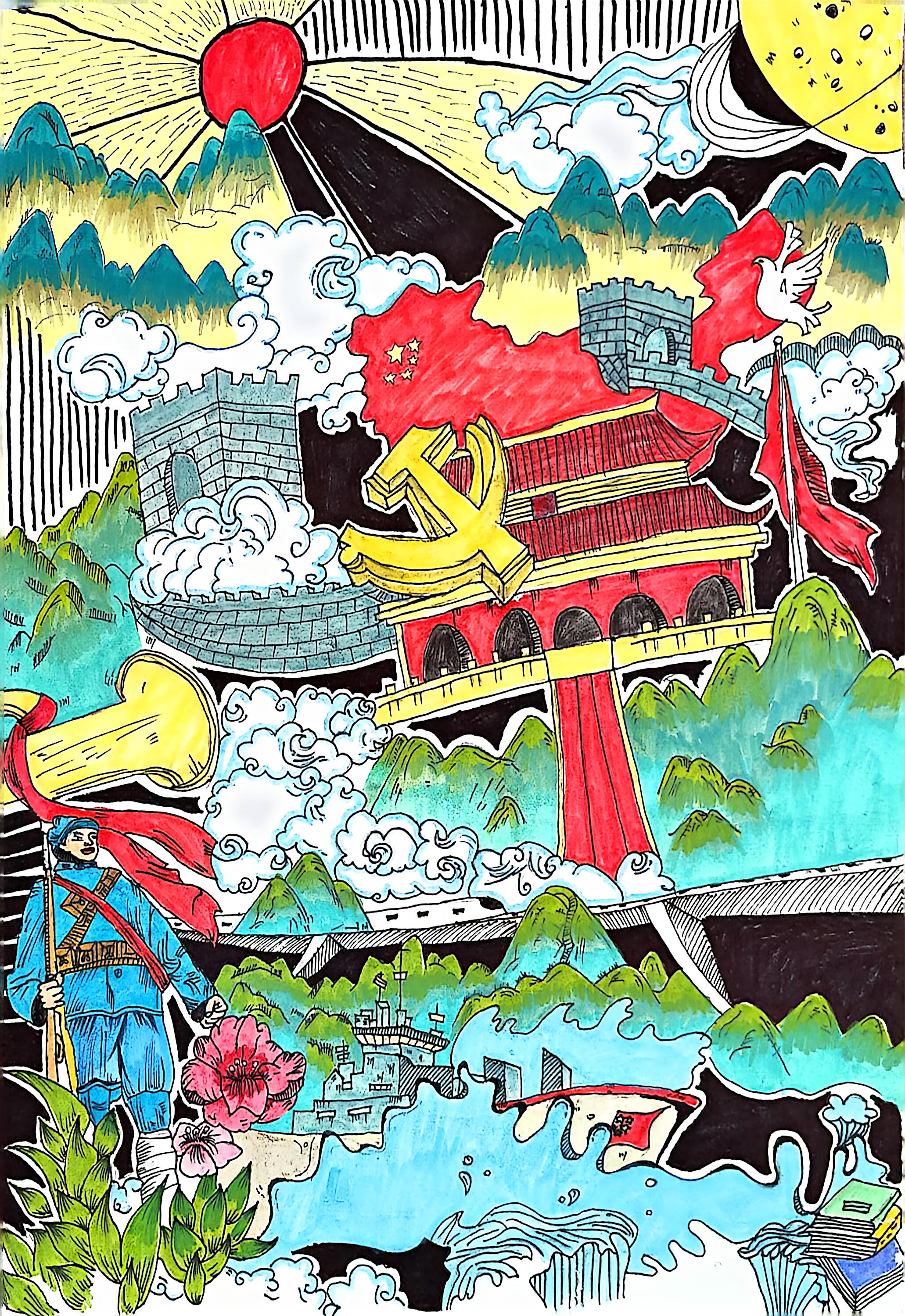 这幅画作以红色革命精神为魂,铺展家国情怀图景:画面中央,金色党徽与鲜红国旗交相辉映,光芒柔和却充满力量;旁侧老式喇叭仿佛正传递革命宣言,声波纹路隐约可见。 背景里,万里长城蜿蜒起伏,青砖镌刻岁月痕迹;远处天安门城楼庄严肃穆,与长城共同勾勒出华夏脊梁。暖红笔触交织起象征元素,让历史厚重与精神传承相融,既显革命精神的不朽,又藏对家国的赤诚,满是对红色信仰的赞颂。