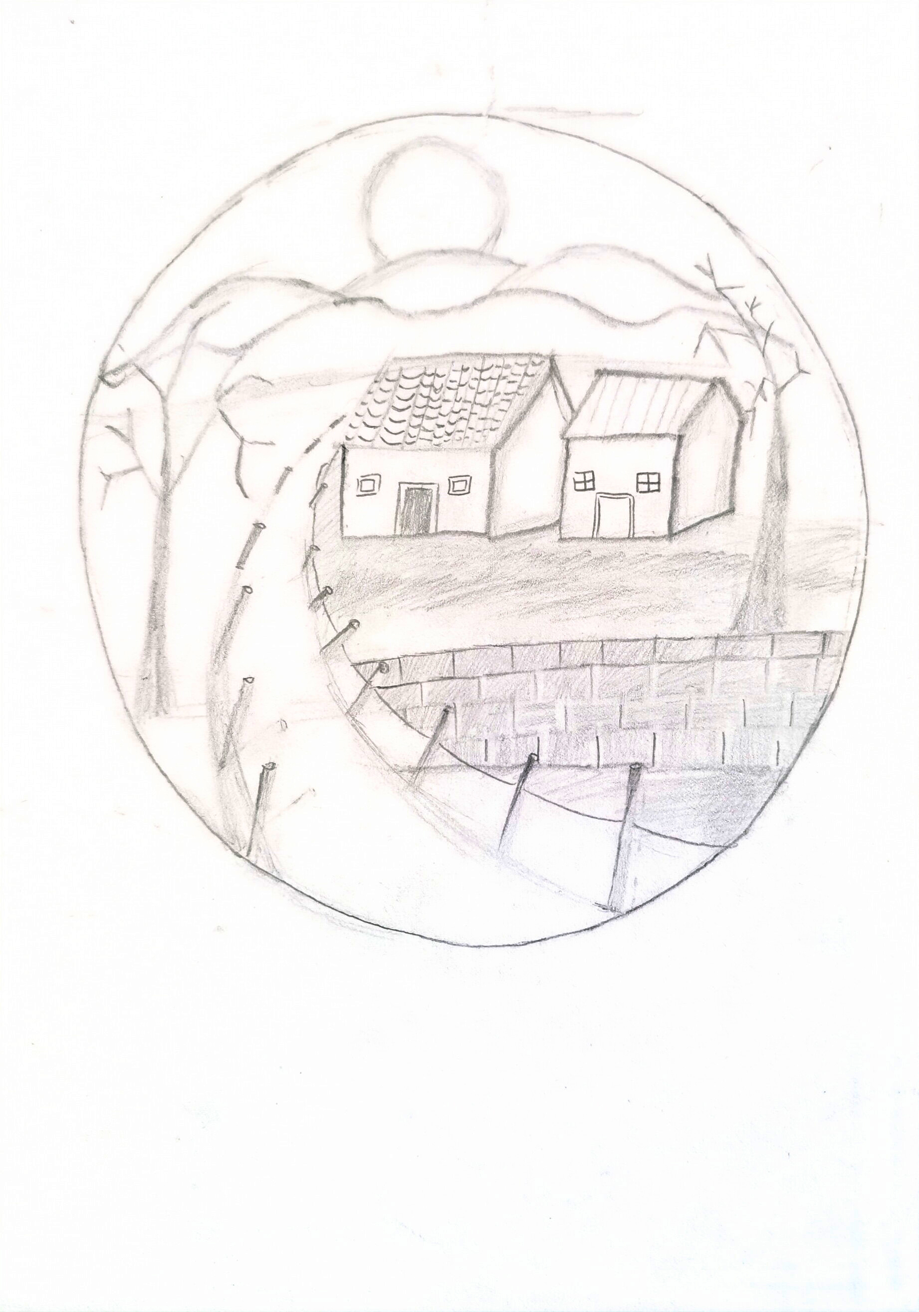 大家好!我画的是《乡间小世界》。你看,圆圆的画面里,弯弯小路通向两座小房子,还有光秃秃的树和石墙。在这里,仿佛能听到小鸟叫,看到风吹过小路。每次想象在这乡间玩,就觉得超自在。欢迎大家来这乡间小世界,走走小路,看看小房子,保证你们会喜欢这小小的、宁静的美好哦!