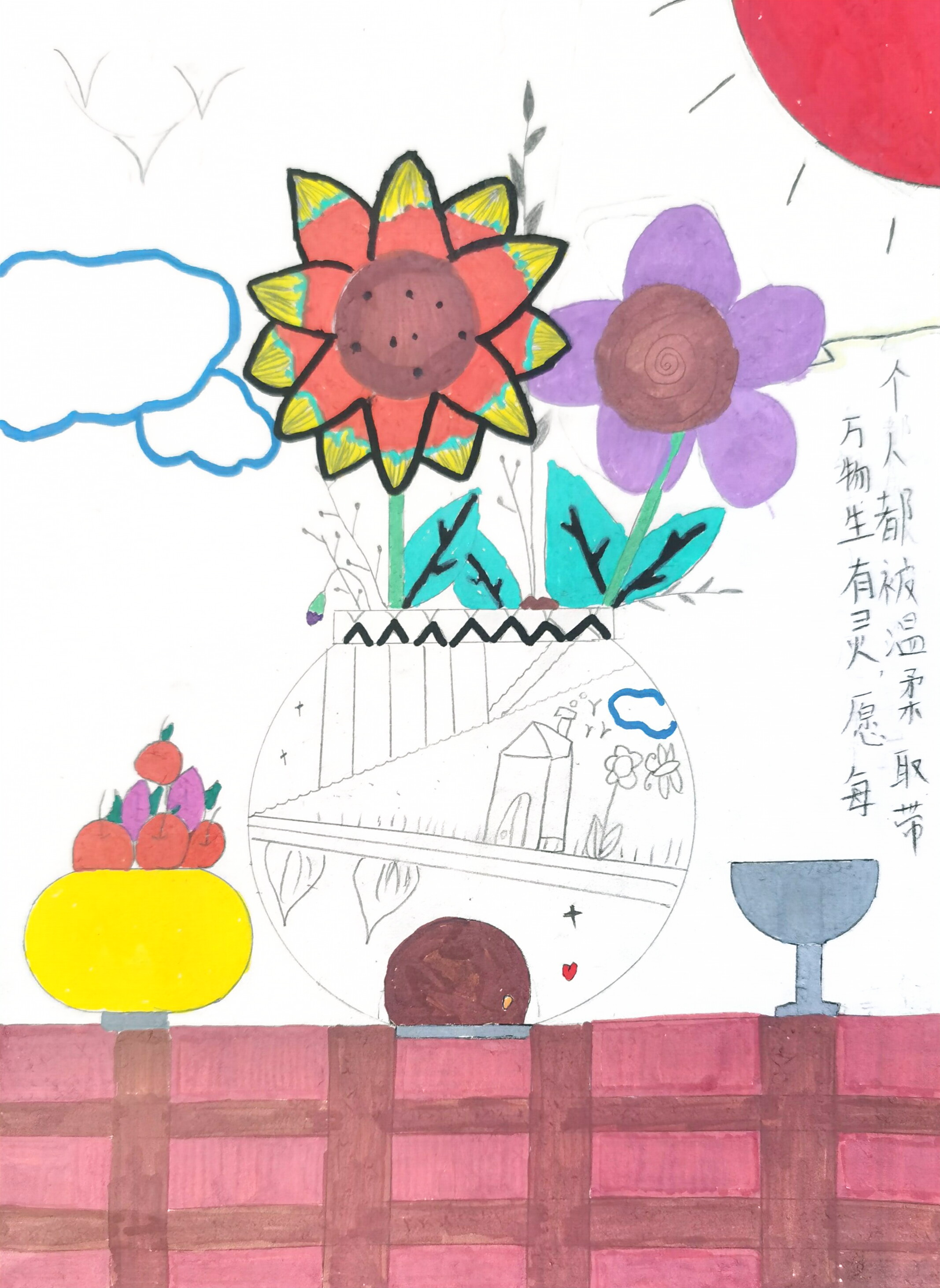 大家好!我画的是《生态观光温柔小乐园》。这里有超漂亮的花儿,还有藏在花瓶里的小小世界,就像观光旅游时看到的美好景色。我们要保护生态,让这些花儿和小世界一直美下去。欢迎大家来这生态观光小乐园,看看漂亮的花,感受温柔的生态之美,保证你们会爱上这片充满生机的地方哦!