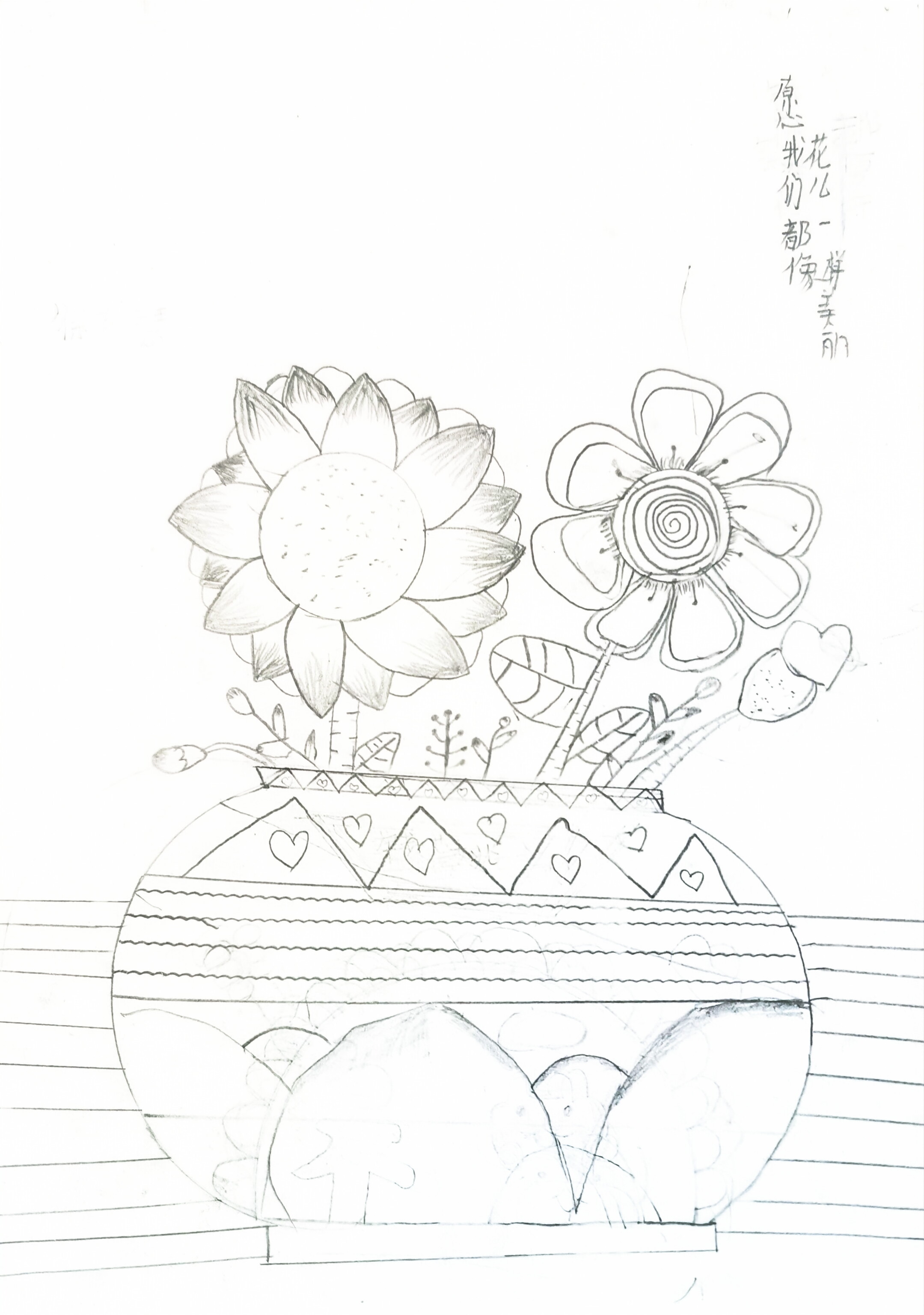 大家好!我画的是《花儿一样美丽小花园》。你看,花盆里的花儿超漂亮,还有带爱心的花纹呢。旁边的字说愿我们都像花儿一样美丽。每次看到这些花儿,就觉得世界超美好。欢迎大家来看看这美丽的花儿,保证你们会爱上这片充满生机的小花园哦!