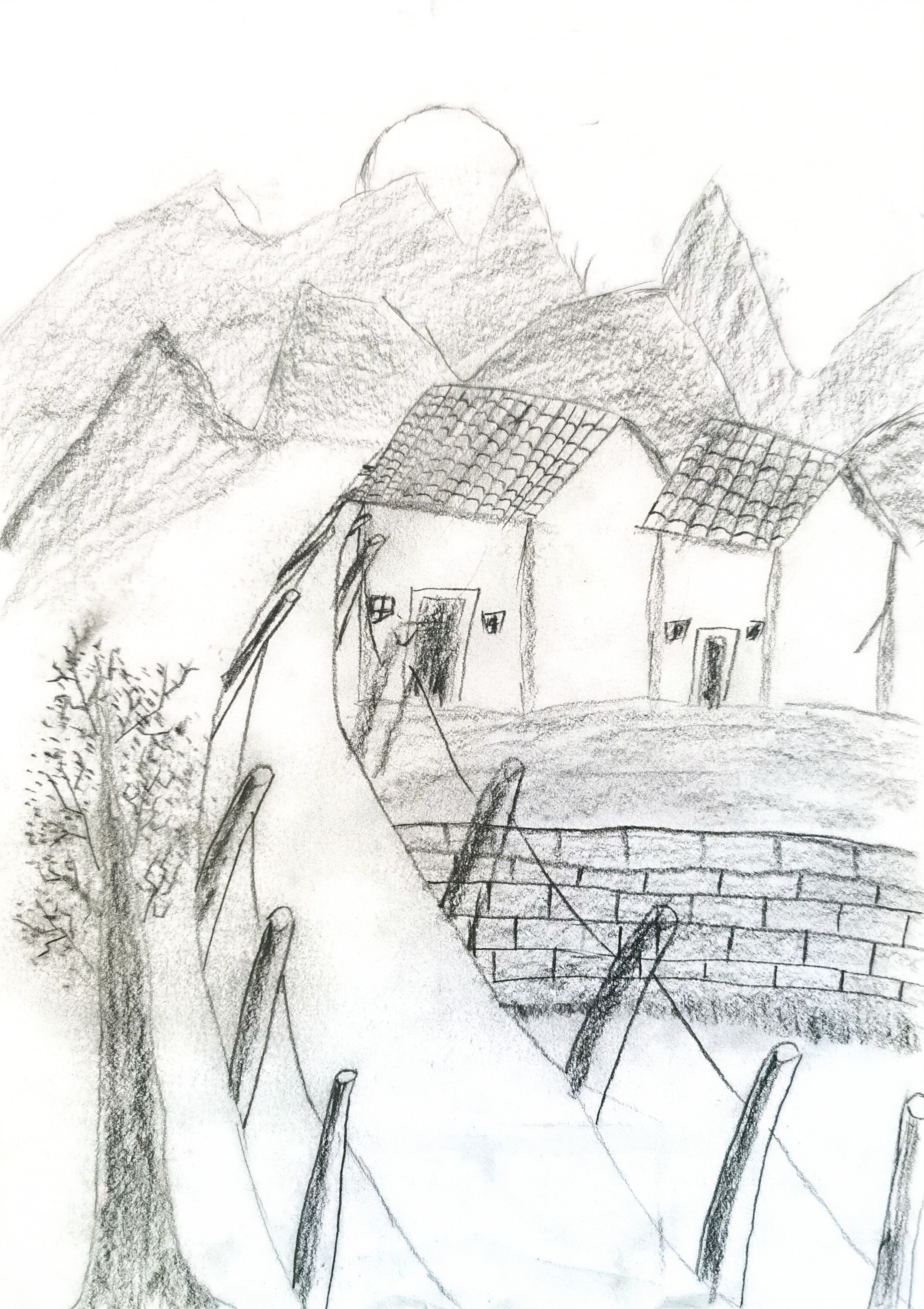 大家好!我画的是《山间小路宁静屋》。你看,弯弯的小路通向两座小房子,旁边有树和石墙,还有高高的山。在这里,感觉特别安静,像世外桃源一样。每次想象在这山间玩,就觉得超开心。欢迎大家来这山间小路宁静屋逛逛,看看小房子,走走弯弯的路,保证你们会爱上这片小小的、宁静的美好哦!