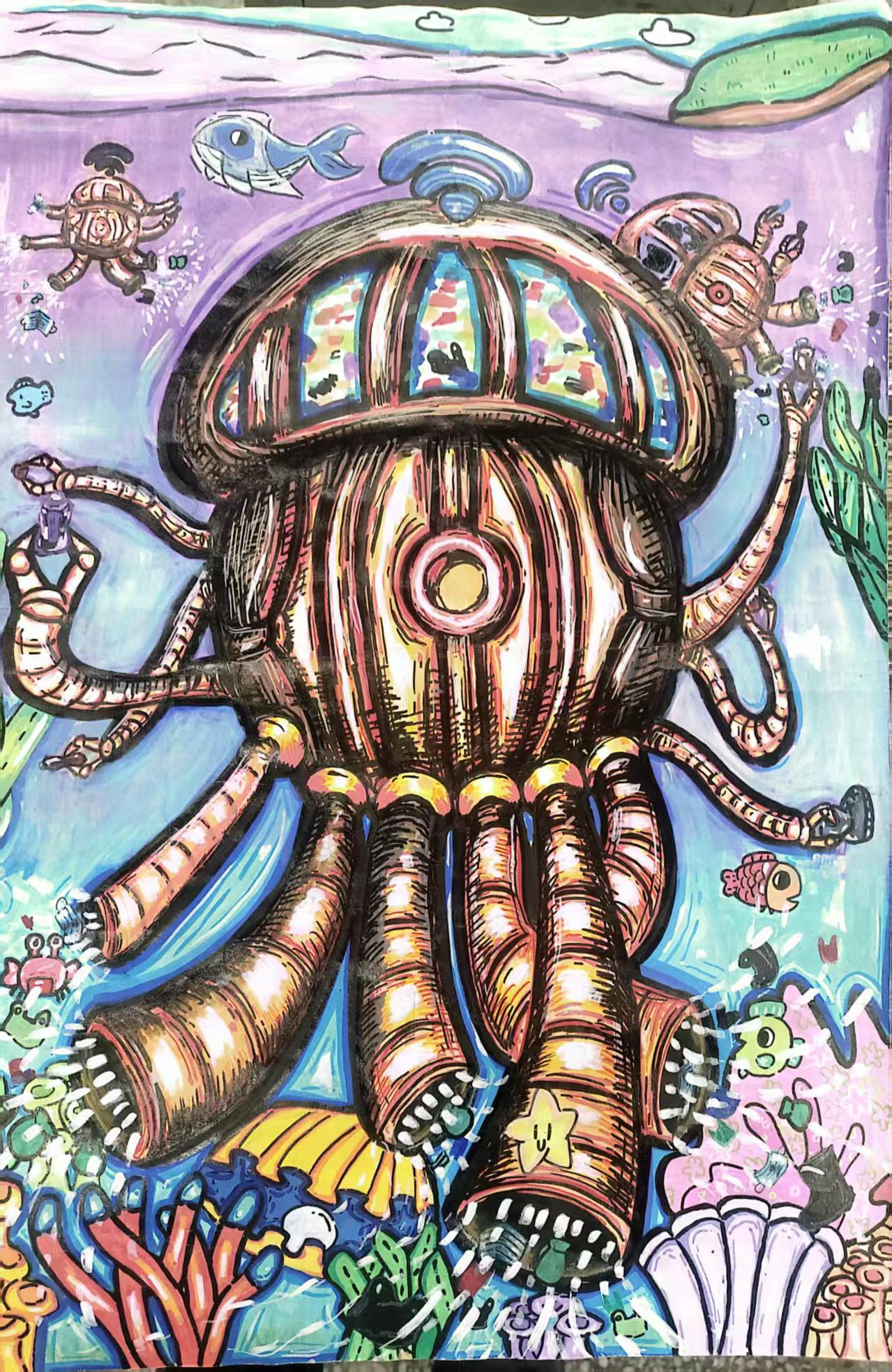 作品针对工业发展中 "乱排乱扔" 的环境问题 —— 塑料、不易腐烂垃圾涌入河道,污染水资源、破坏生物栖息地,构想一款河道专属的智能垃圾搜集处理器。 该设备形似流线型水生物,贴合河道水流设计,可固定布点或缓速巡航。它搭载高清垃圾识别系统,能精准捕捉塑料瓶、废弃包装等杂物,通过柔性机械臂或负压吸附装置将垃圾搜集,再转入内置收纳舱分类暂存,方便后续统一清运。 画面里,处理器在渐清的河道中运作,周边有鱼虾游弋,岸边草木舒展。既展现科技对污染的治理力,更传递 "还河道清澈、护生物安居" 的愿景,为人类与河道生物筑牢干净清洁的生态家园。