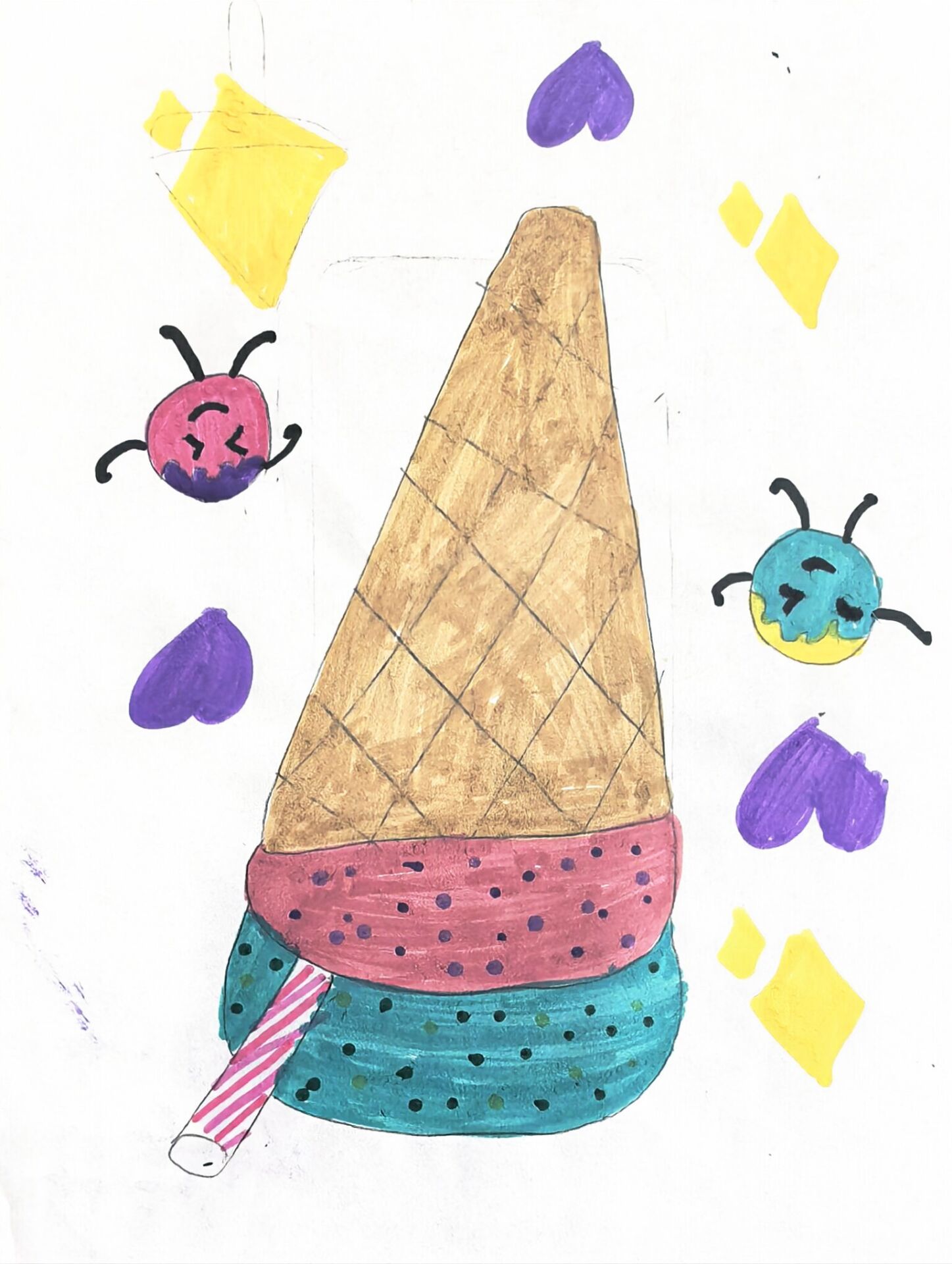大家好!我画的是《彩色冰淇淋欢乐派对》。你看,这个冰淇淋 cone 有粉色和蓝色的冰淇淋,还有条纹吸管,超好看。旁边还有两个可爱的小虫子,紫色爱心和黄色钻石点缀着,像在开派对一样。每次看到冰淇淋就觉得夏天甜甜的,欢迎大家来参加这个冰淇淋欢乐派对,保证你们会爱上这美味又可爱的画面哦!