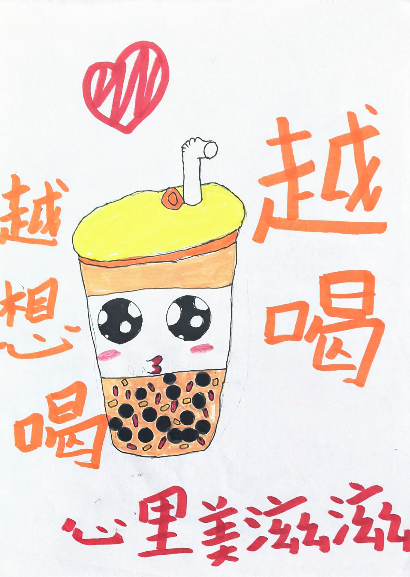 大家好!我画的是《珍珠奶茶萌趣屋》。你看,这杯珍珠奶茶有大大的眼睛,还带着腮红,超可爱。旁边的字说 "越想喝越想喝,心里美滋滋",就像我每次看到奶茶的心情。珍珠奶茶甜甜的,还有好多珍珠,每次喝都超开心。欢迎大家来珍珠奶茶萌趣屋,看看这杯萌萌的奶茶,保证你们会爱上这甜甜的美味哦!